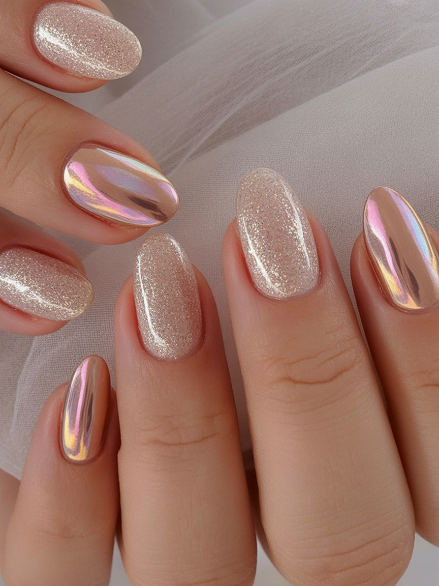 When it comes to real application, this style goes very well with almond shaped nails or oval shaped nails. It’s an ideal choice for evening events or if you just want your hands to look like they belong in a fashion editorial. Combine it with soft metallic eye shadow, or satin products to enhance the glow. Plus, chrome finishes are a major trend for 2025—so you’re hitting that trends inspo mark effortlessly.