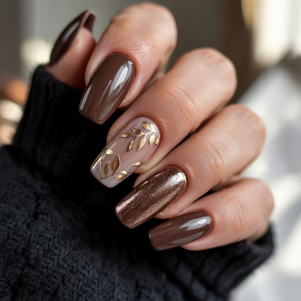1. Glossy Cocoa and Gold Leaf Nails