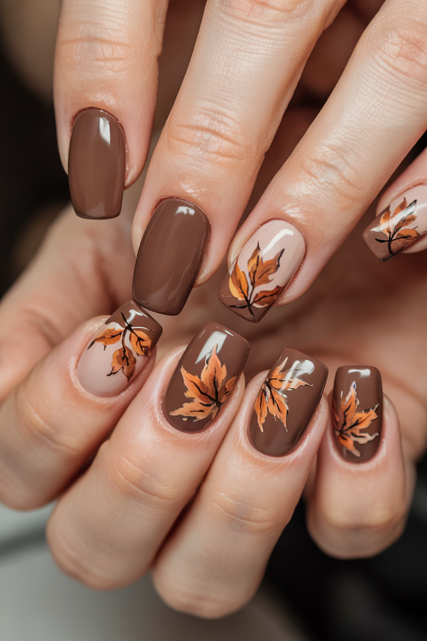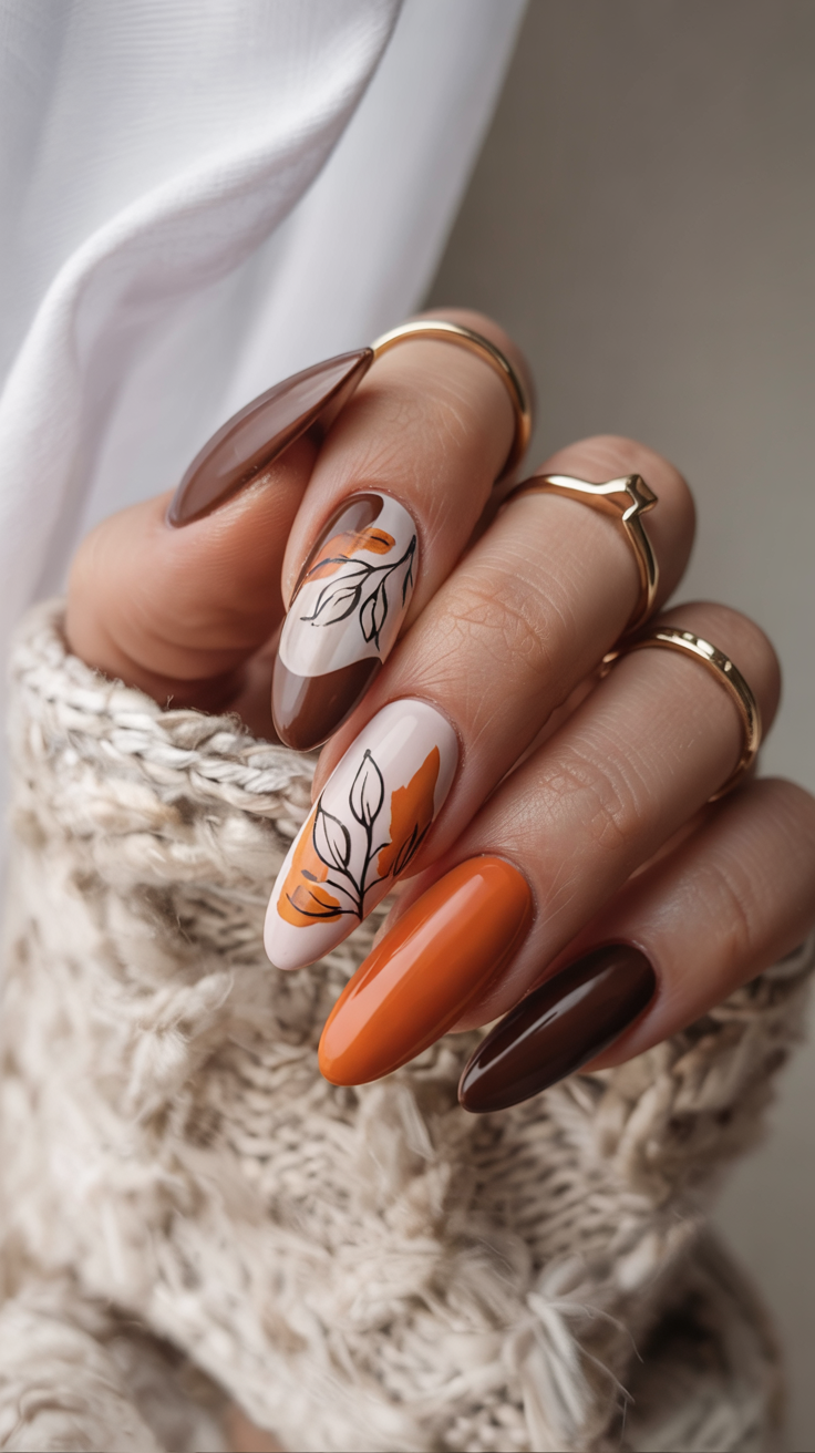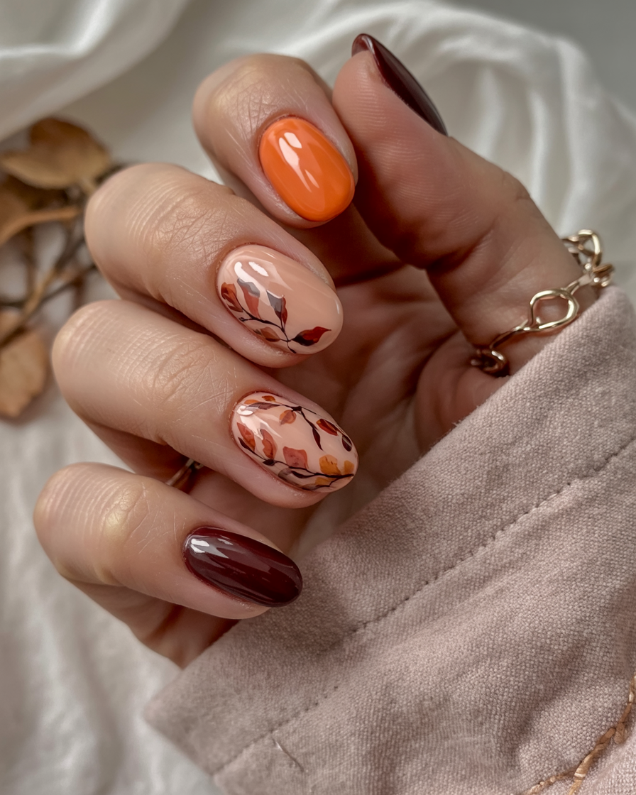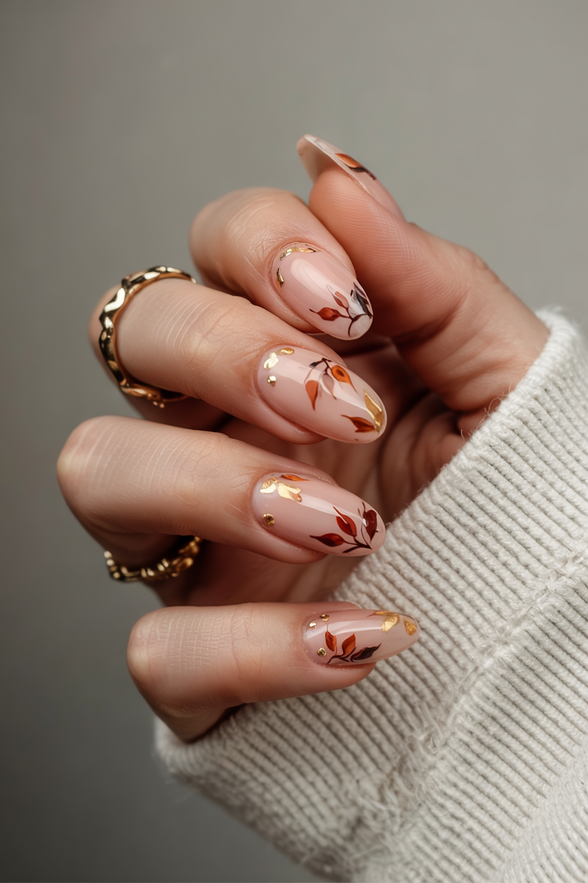 These nails whisper fall rather than shout it. They are gentle blushes of blush undertone and soft orange-brown details in leaves, and they seem a tranquil walk in a park when trees have just begun to change color. The flakes of gold capture the light in a delicate way, a very small and so valuable memory of the beauty of autumn.