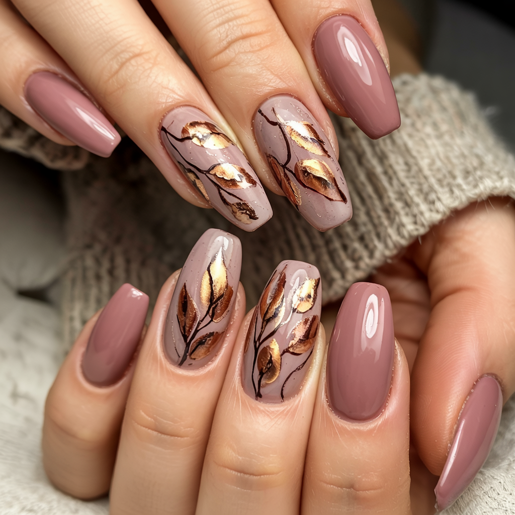This design has a sort of a silent luxury – dusty mauve with fine golden leaves. It is the type of a manicure that does not scream to be noticed but it does receive lots of compliments.