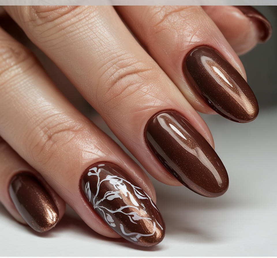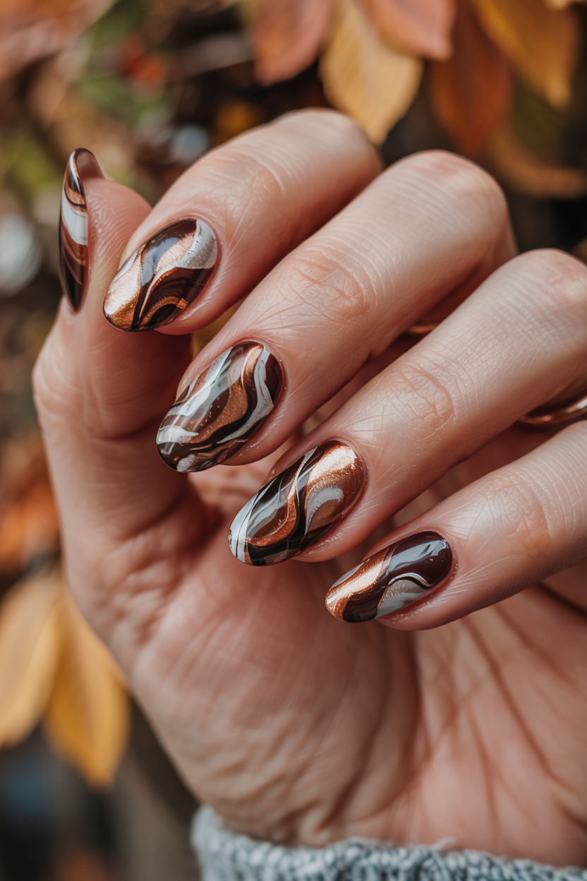 This is a rich cocoa brown set which has intensity and warmth such as a hot chocolate made of velvet. This is a mature version of the October nail ideas with a spiral to sophistication brought by the single marbled accent without taking away the familiar sense of welcoming relaxation.