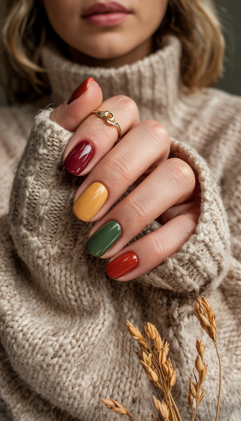 It is the kind of manicure which you could put on and feel like you have wrapped your fingers in your favorite knit, warm, nostalgic, and completely happy. The color of each nail is different autumn colors: mustard, hunter green, rust, burgundy. Both of them form a wearable rainbow of the best fall colors in October.