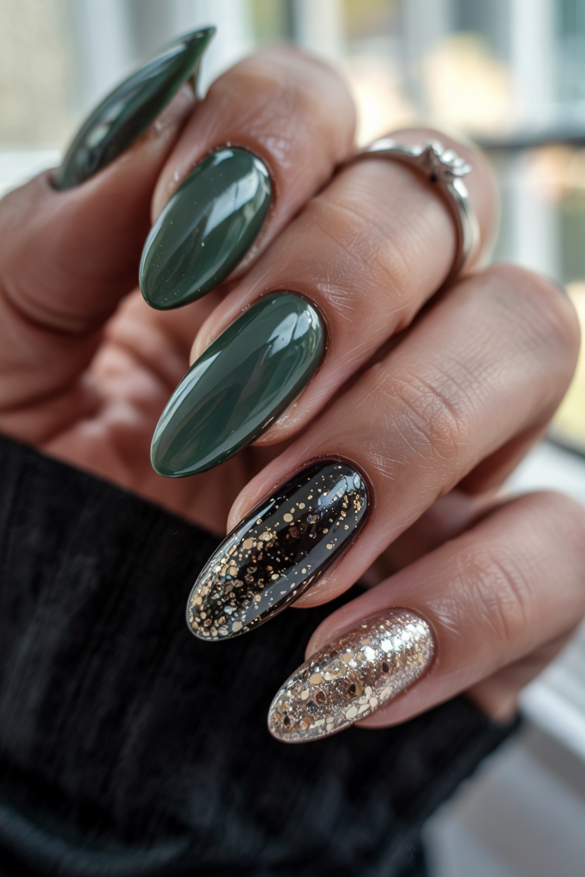 It is ideal among the coffin or square nail lovers who wanted something glamorous and earthy at the same time. The dark tone-downs cooler complexion, the glitter is a welcome touch without being head to toe halloween. To maintain it and to keep it shiny and sealed, reapply a clear coat mid week.