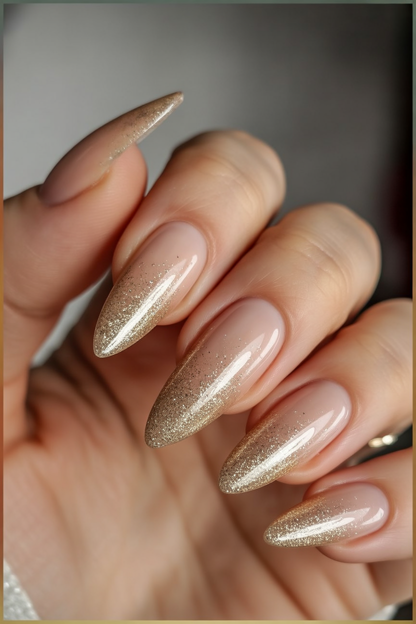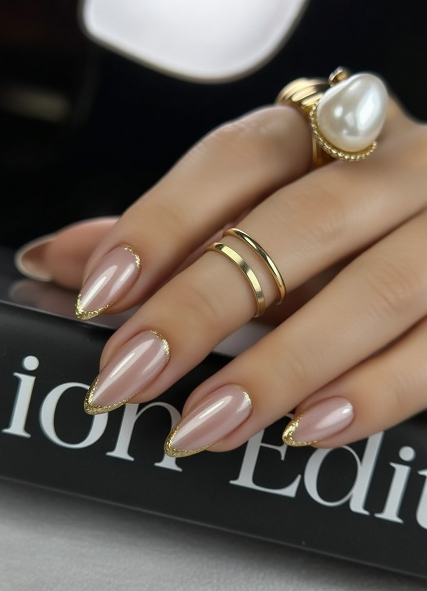 Something about a soft almond shape with a sheer nude base and a light gilt shimmer is so luxurious in its quietness. These nails are like drinking champagne at an old-money autumn garden party, sophisticated but lighthearted, fragile but present. The glitter is not loud, it is rather a murmur of light that catches just enough to remind you that elegance is never accidental.