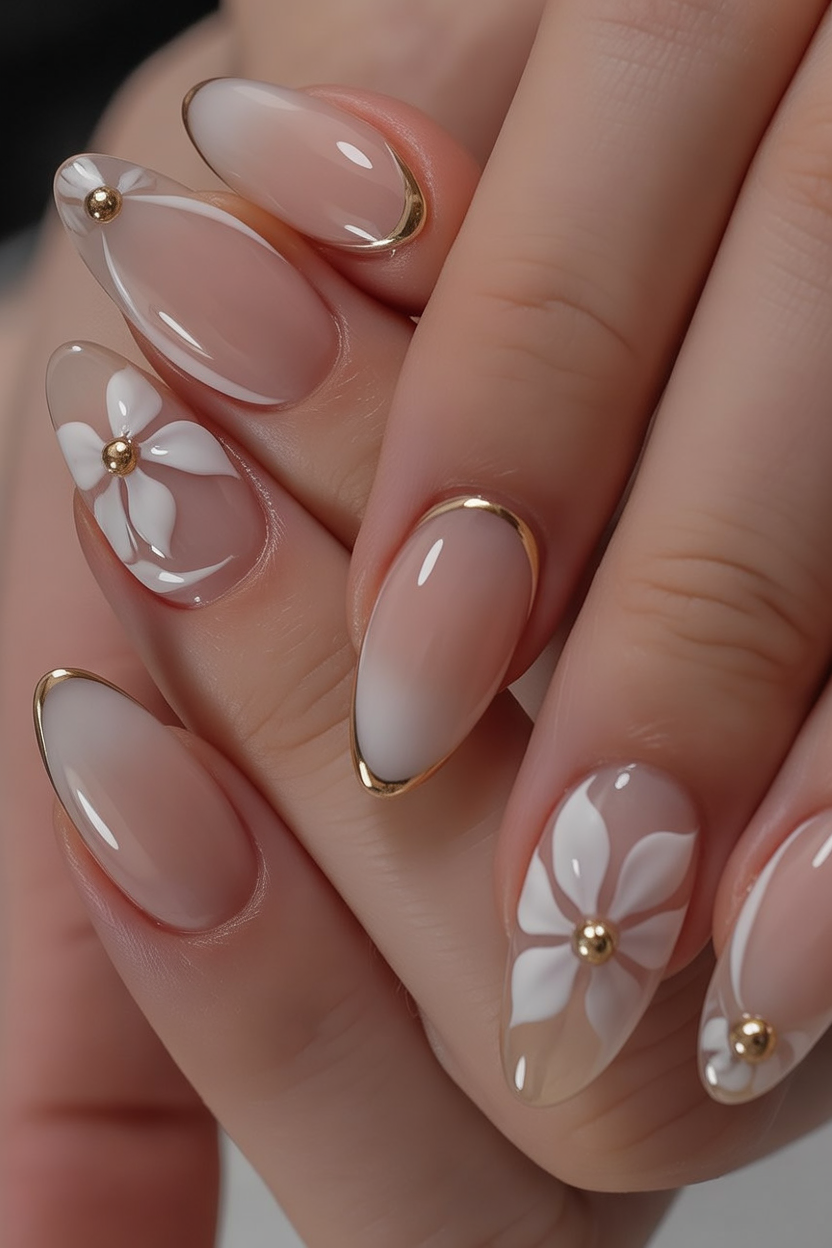 Delicate golden trails on the surface give soft nude nails an air of mystery. It is a manicure that speaks of class and has just the right amount of glitz to be festive. The appearance is simple, uncomplicated, and easily classy.
