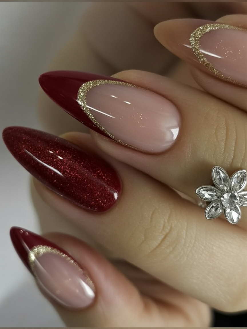 Not many things are as sophomore as a rich red combined with gold. These nails combine strong Bordeaux ends with light golden curves, a perfect balance between passion and good taste. It is a statement manicure, not loud, but bold enough to draw attention in the most refined manner.