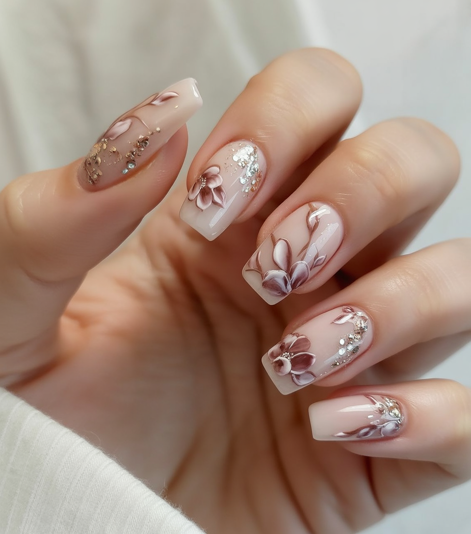 These nails add a romantic touch of hand-painted blossoms with a little bit of soft glitter, which makes the design feel light but luxurious. It is the type of manicure that is feminine in its tone but has a touch of sophistication. The craftsmanship is nearly like finely-china or embroidered cloth.