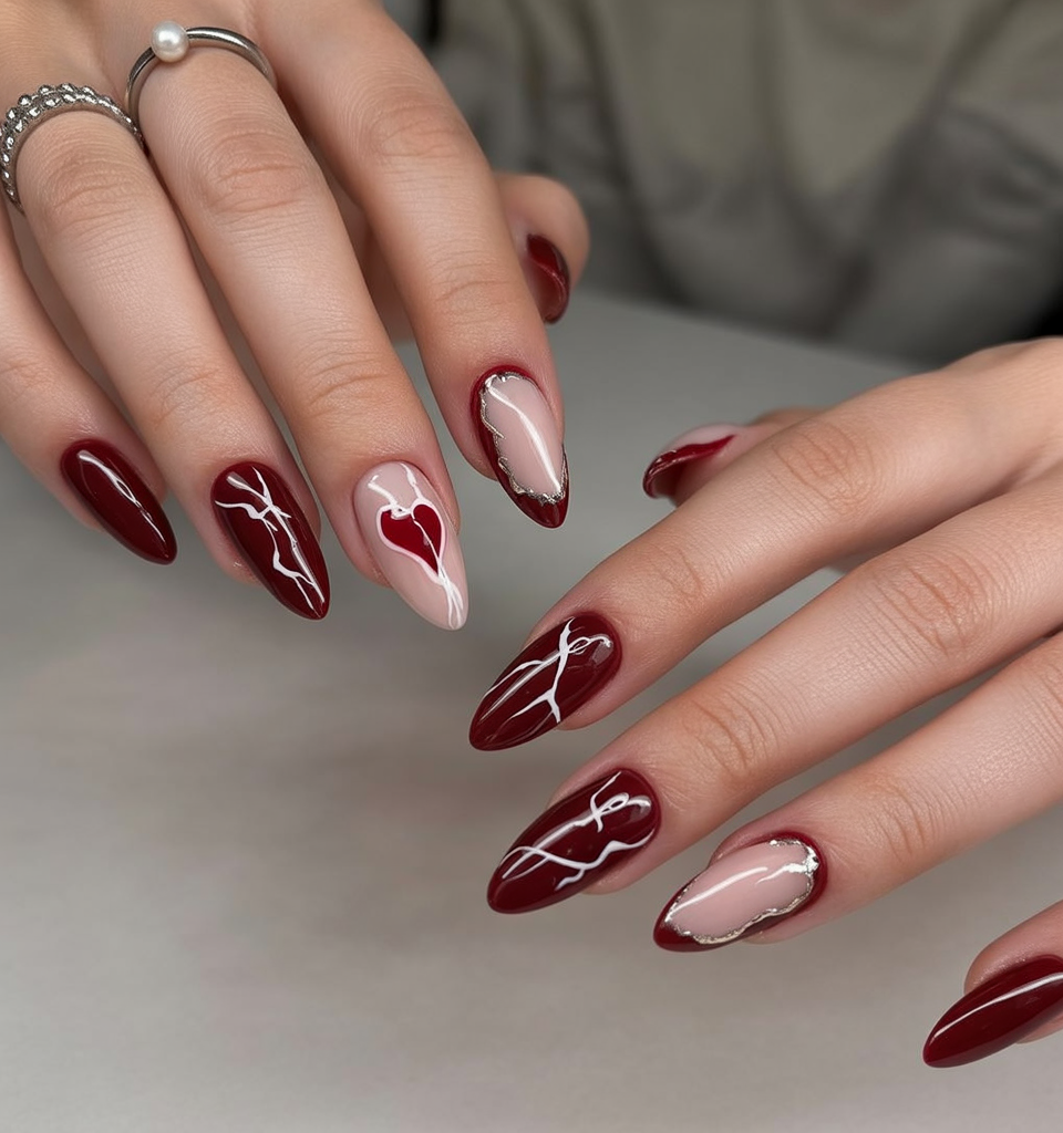 Nude accents and heart themes combined with bold burgundy nails make this manicure romantic and full of personality. The design is a story – dramatic and playful and full of charm. Not nails, it is an accessory with a purpose.