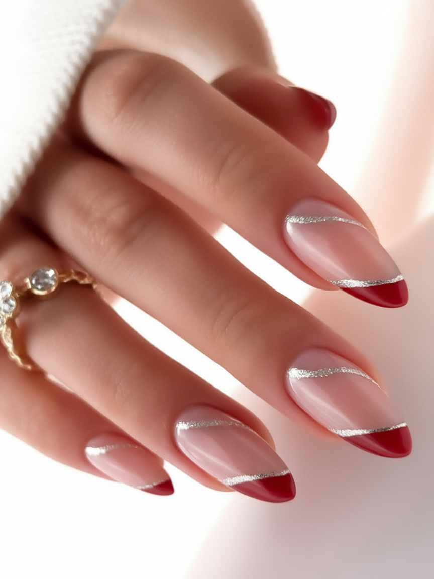 This design is colorful and fashionable with bright scarlet ends and silver waves over a nude base. It is festive (as a glass of bubbly champagne at a Christmas party). The energy of these nails is that you want to flaunt your hands.