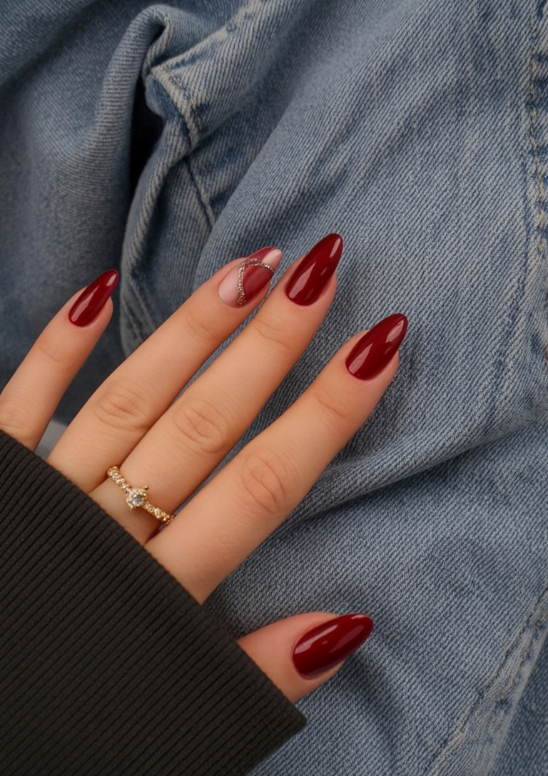 Garnet bottom with one accent nail and a sparkling ribbon wrap on it- these nails are bold and feminine at the same time. They are a tale of confidence and grace, and there is enough sparkle to make it feel celebratory without being over the top.