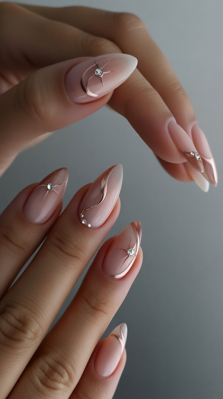 Light blush colors with a sprinkle of glitz make this design seem like a hidden opulence. These nails are the epitome of subtle glamour with fine metallic swirls and delicate gems that catch the light. They are the type of manicure that causes you to look at your own hands slightly longer.