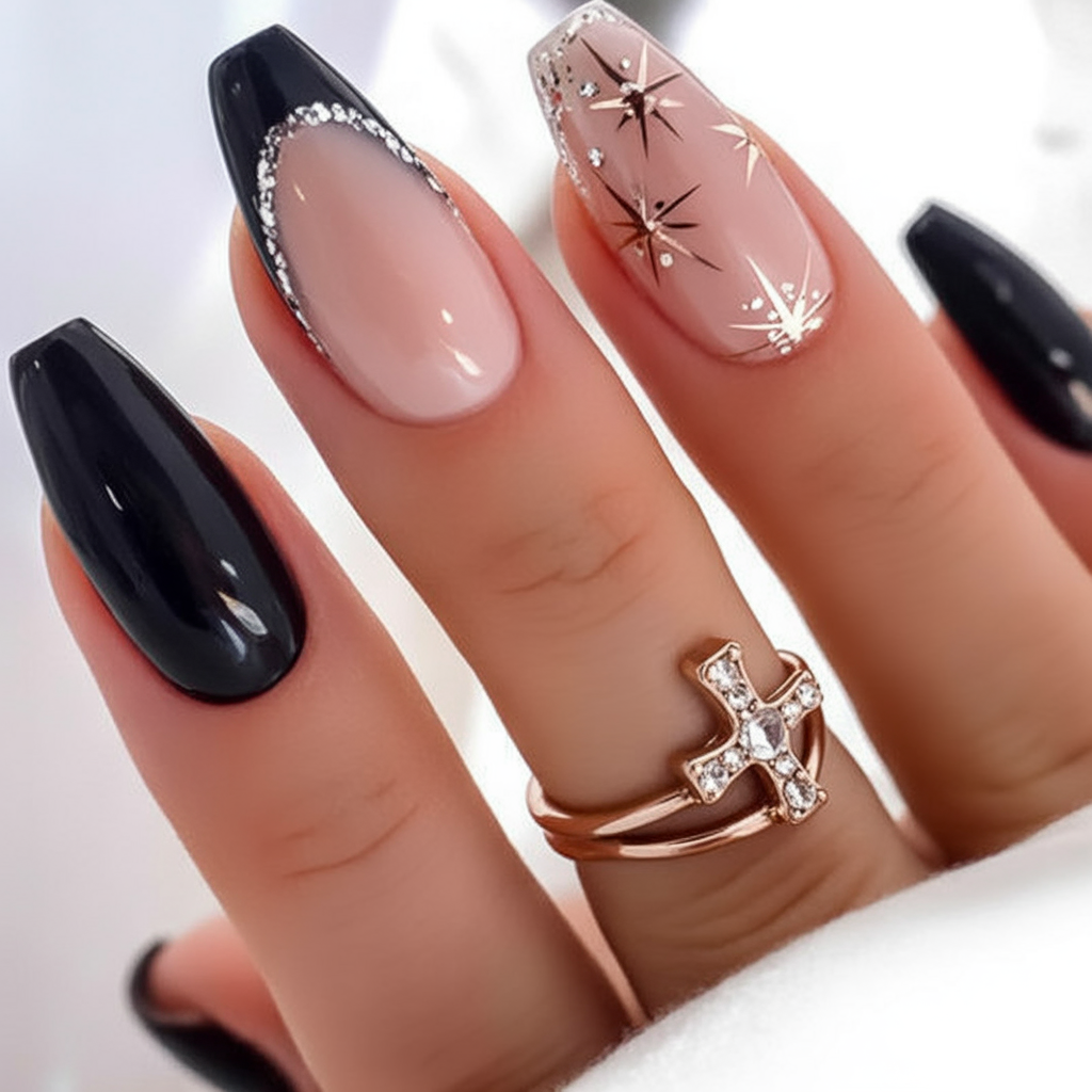 It has a certain irresistibly dramatic quality to combine deep black polish with soft nude tones, topped with sparkling accents. These nails promise the assurance of an evening dress, graceful, daring, unashamedly glitzy. The rhinestone glitter and the starburst detailing make this manicure look like a gala night sky.
