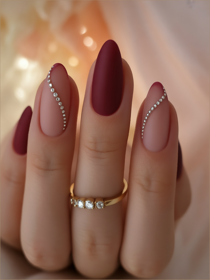 Dark saturated burgundy is combined with gentle nude in a pattern that is both royal and subtly rebellious. The rhinestone curve provides the right amount of sparkle, such as a diamond necklace with a silk dress. These nails are not a nail polish, they are a statement, a statement of self-confidence.