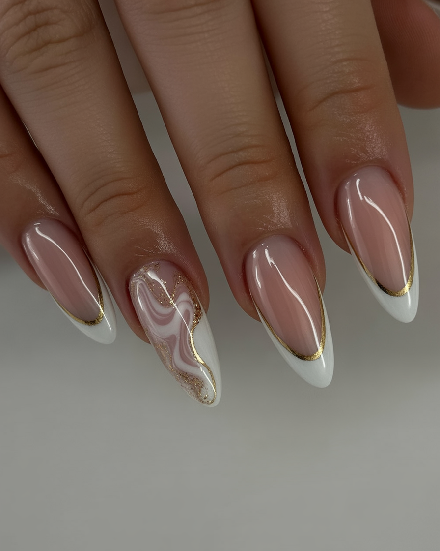 Classic french is beautifully modernised here, with a white almond tip, edged with gold, and a marble accent that seems like exquisite stonework. It is sparse and abundant, a high design that feels comfortable all year round. This is the kind of manicure that is as old as a pearl earring.