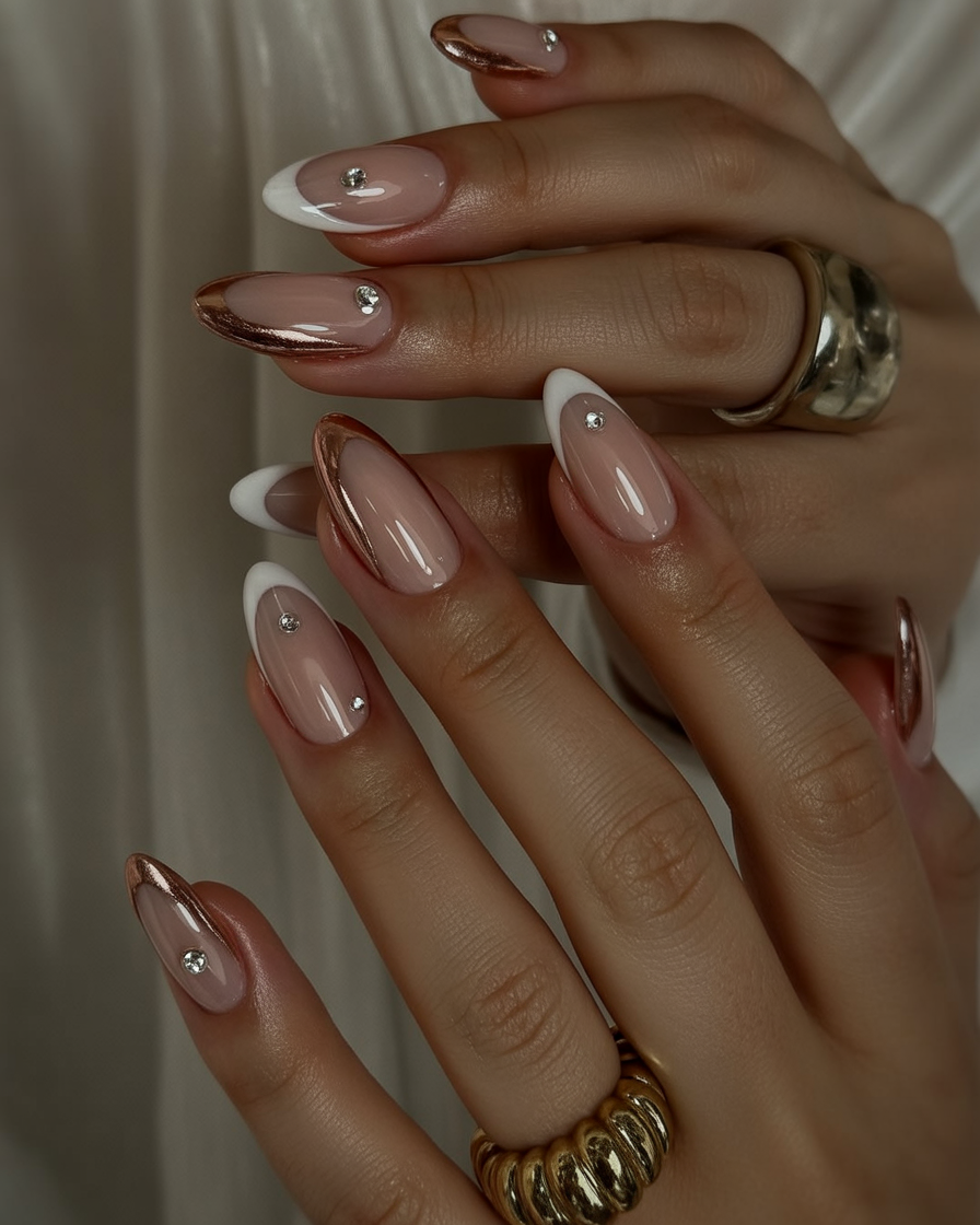 This manicure is a blend of contemporary style and classic polish: the tips are in white and rose-gold french, and each is topped with a small crystal. It is like champagne bubbles in the sun, quiet but jovial. An elegant style is one that is found in details.