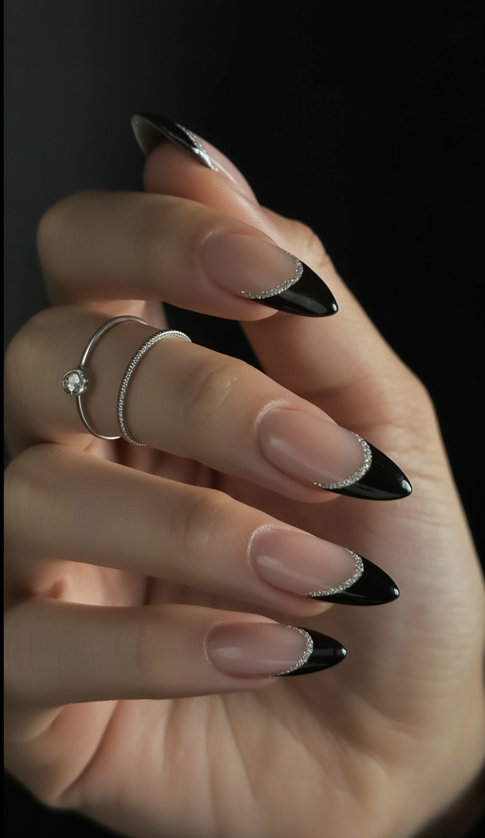 This manicure is the ultimate definition of low key drama sharp black almond tips with a nude base and silver accents. It is mysterious and exquisite, a black dress with diamonds. The general appearance is contemporary vintage money with enough panache to make it still fresh in 2025.