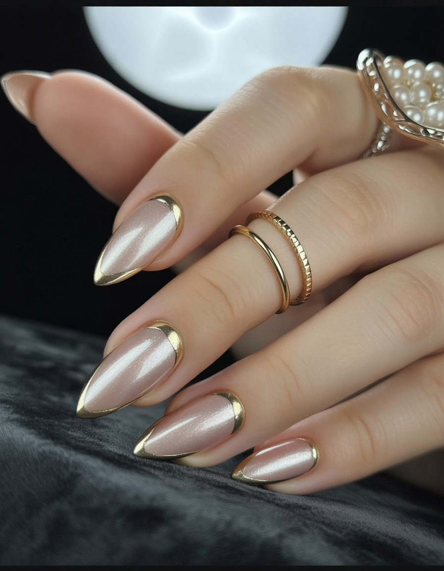This design combines soft shimmer with gold french tips, and the manicure looks as valuable as pearl earrings. The finish is bright, smooth, and classic, and it suits every woman who admires a classic with a 2025 twist.