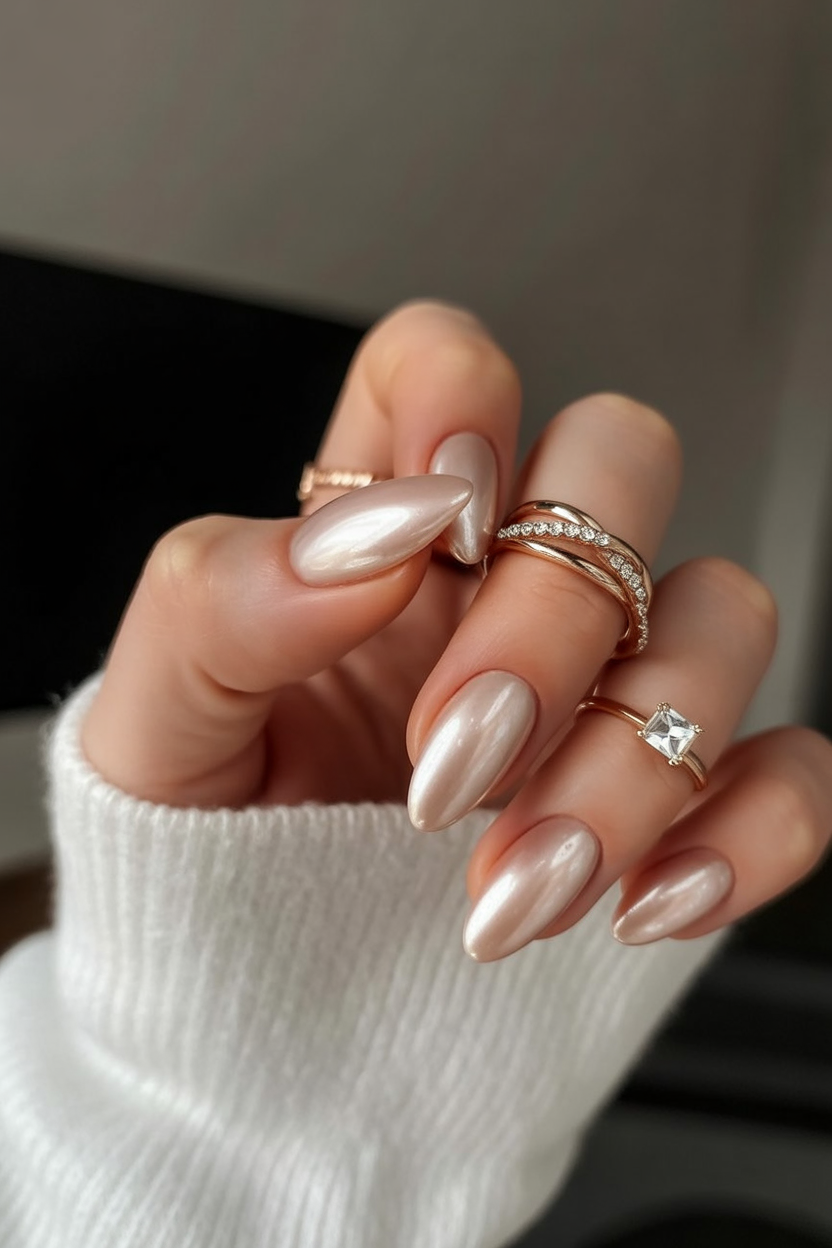 Such nails are pearlescent and ethereal and timeless. The almond form adds the sense of length, and the smooth shine reminds a silk cloth in a chandelier. It is elegant but contemporary – the type of nail polish that can transform even the most basic garment into a sophisticated look.