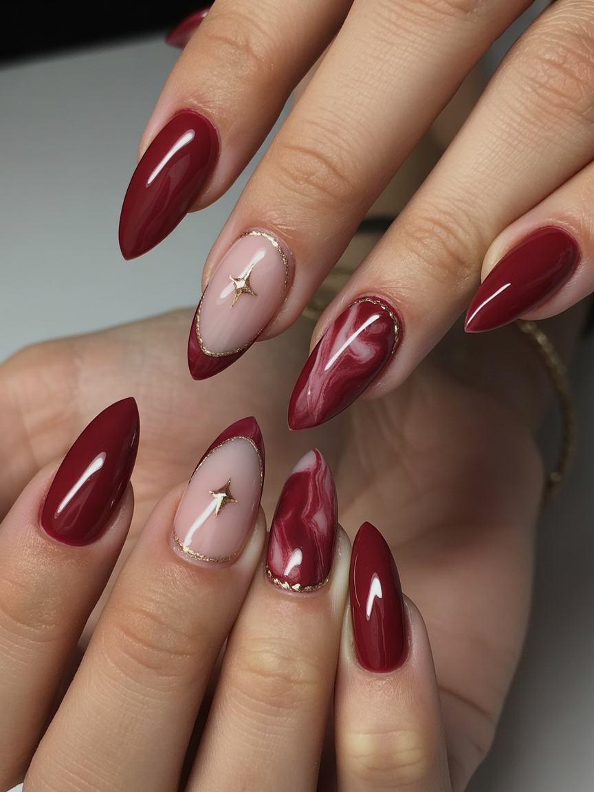 The almond red colors are especially complimentary to fall and winter and provide a sense of warmth and richness to any outfit. The marble detail makes them more depthful than the plain red nails, but the star as a finishing touch makes them memorable.