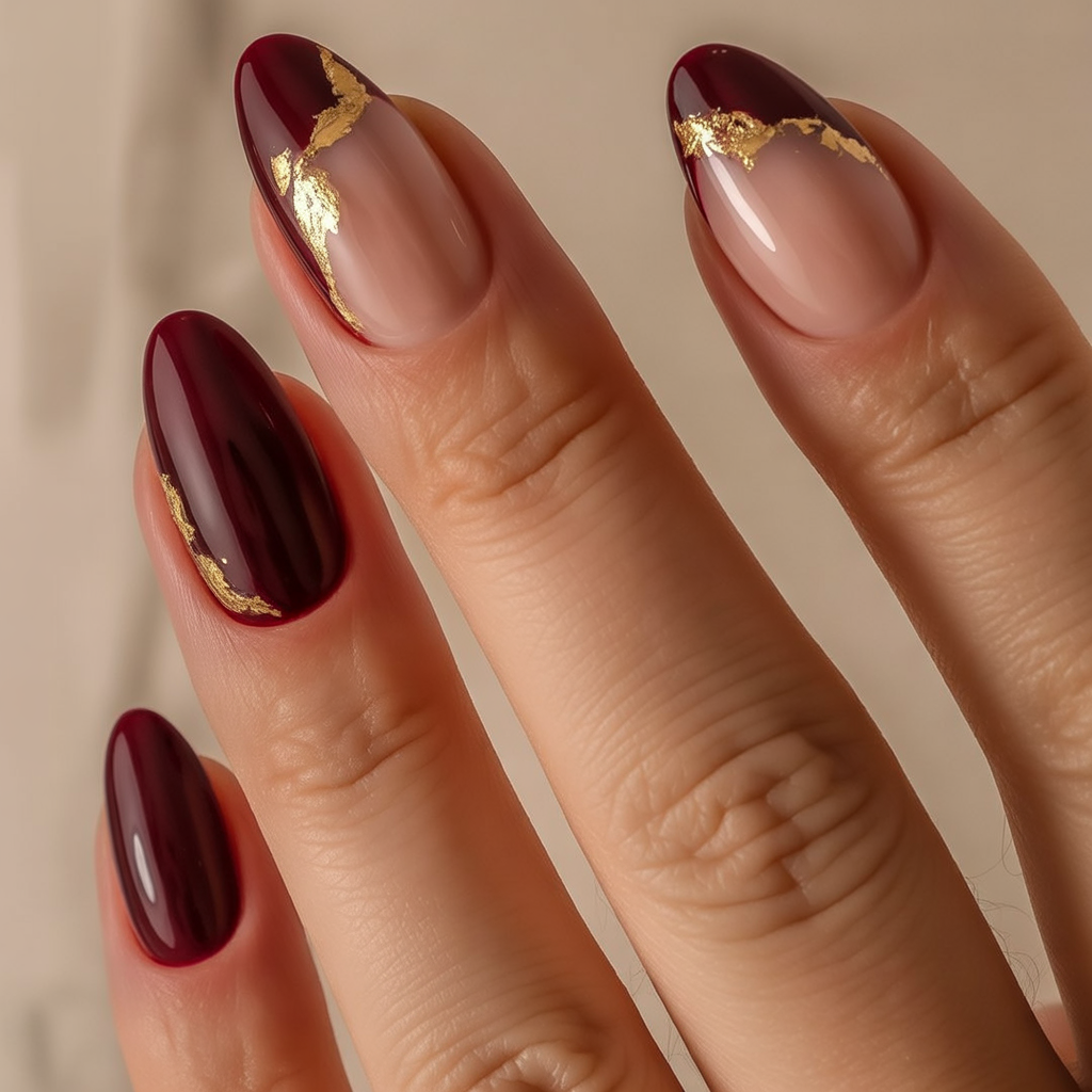 Dark burgundy with gold foil flecks in it — it is all about being rich and sophisticated with this manicure. It is a velvet dress with exquisite jewelry that puts you immediately on a higher plane. The combination of rich sounds renders it opulent but friendly.