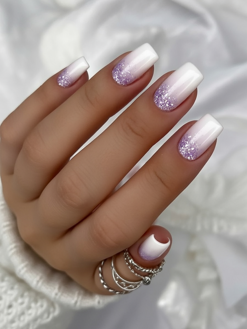 These nails have a dreamy and whimsical quality with soft lavender sparkle fading to a white base. They resemble frosted sugar or sunset skies, an appearance that is light and refreshing. There is an innocent femininity in this design which nevertheless is stylish.