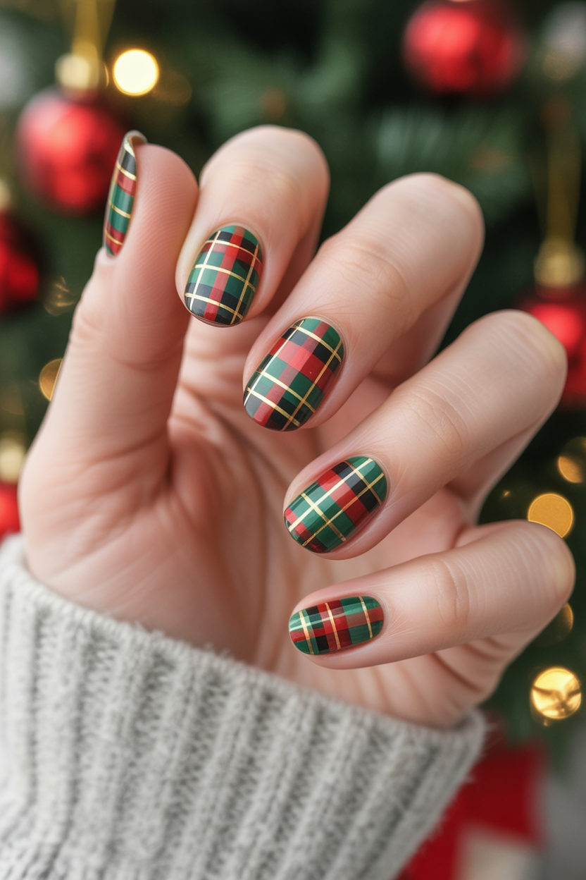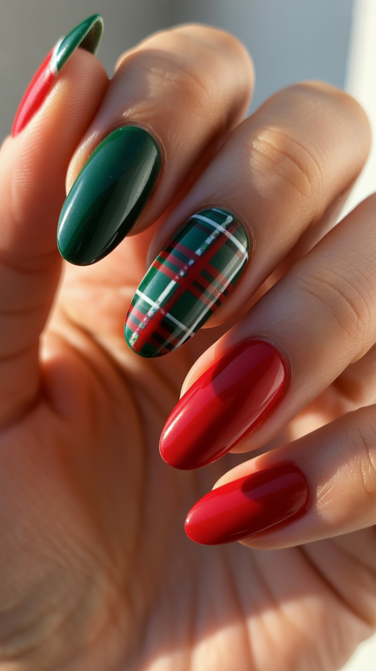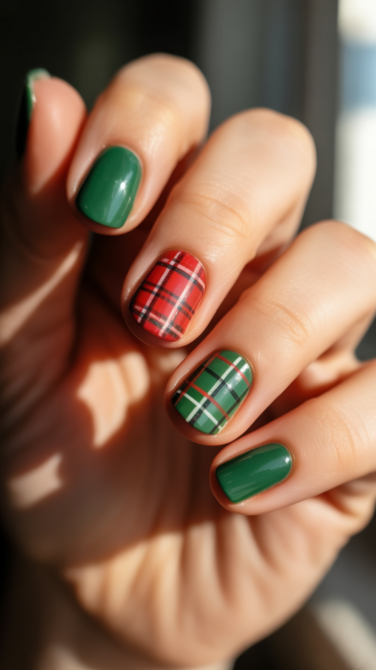 17. Red and Green Plaid Nails with Festive Holiday Mood