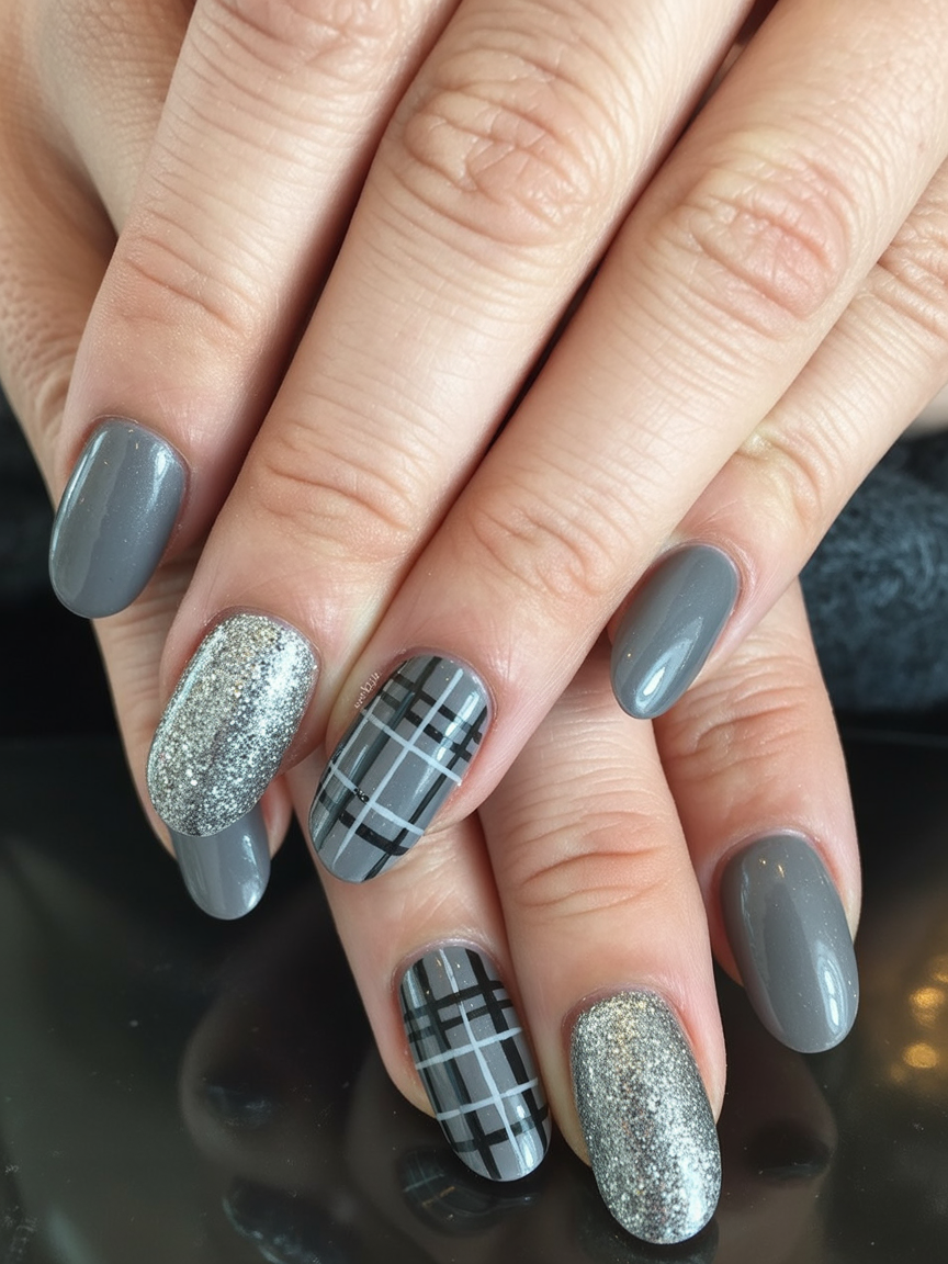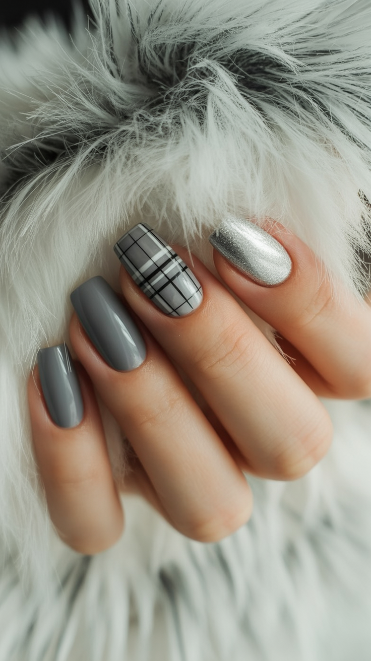 5. Gray and Silver Plaid Nails with Cozy Winter Vibes