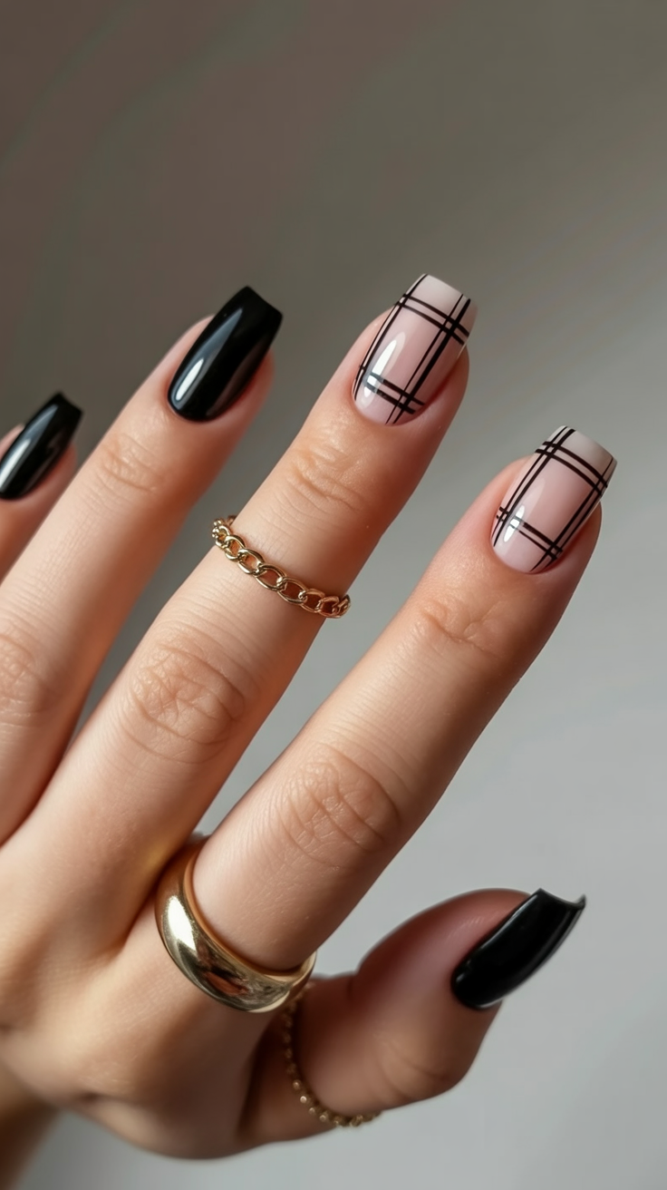 16. Black Nails with Subtle Plaid Accent for a Chic Contrast