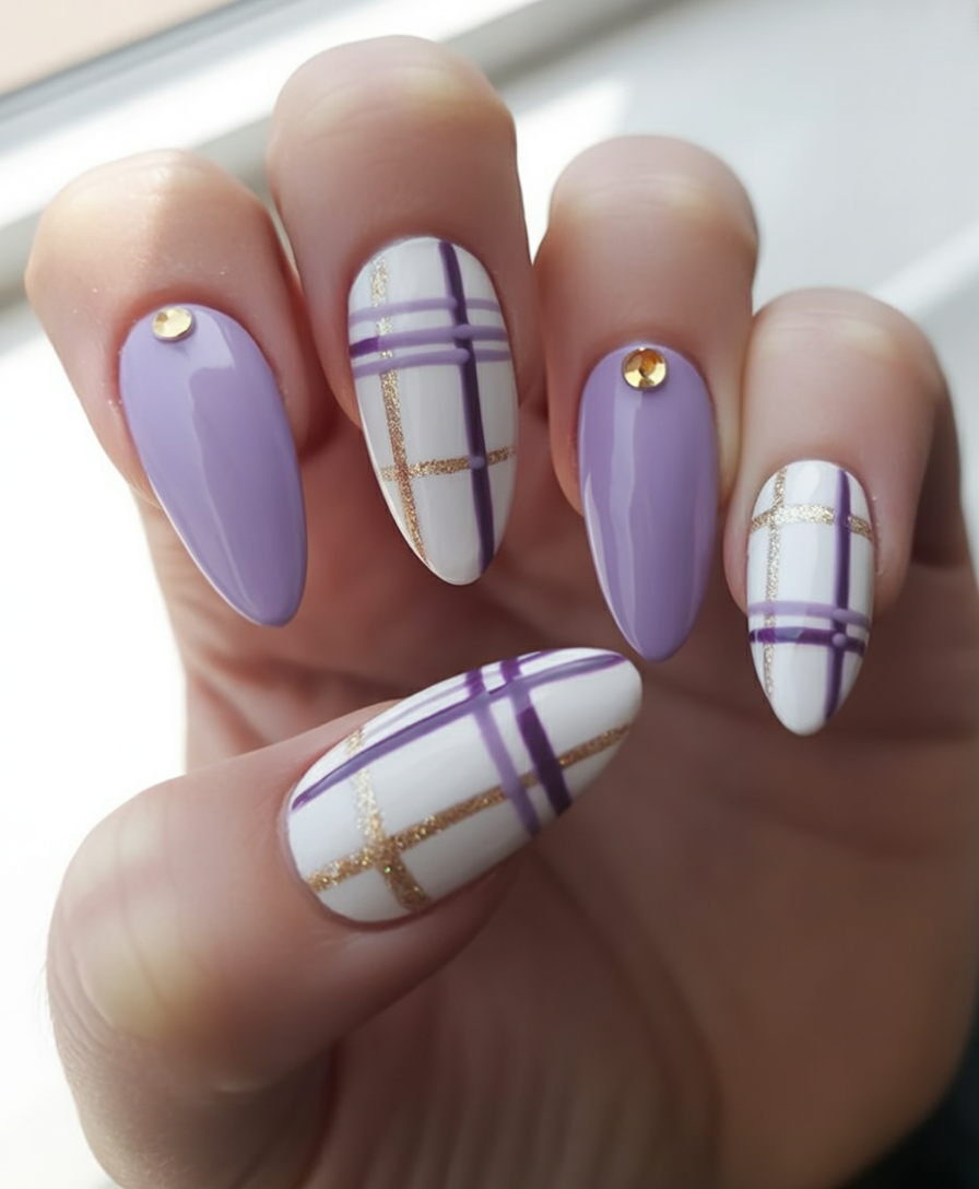 12. Pastel Purple Plaid Nails with Soft, Feminine Details