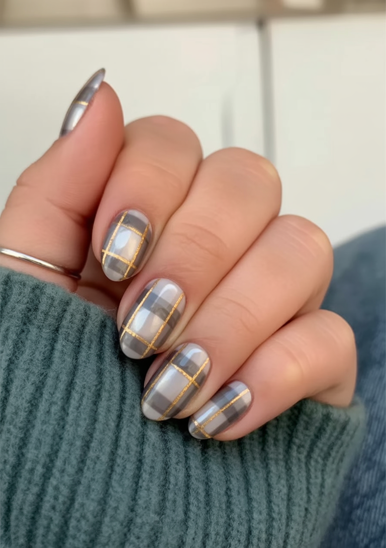 2. Soft Gray Plaid Nails with Subtle Gold Accents