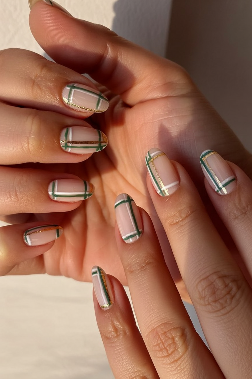 7. Soft Nude Plaid Nails with Green and Gold Lines