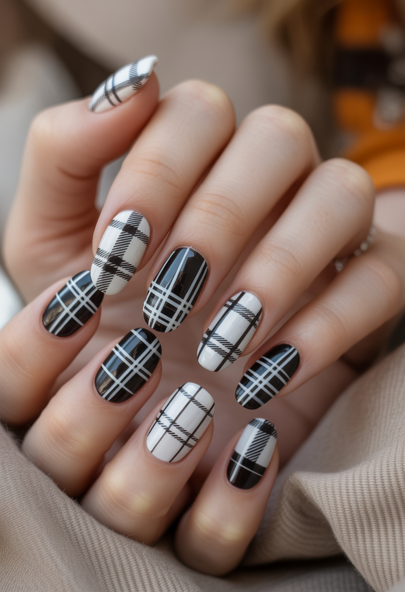 This design is ideal if you enjoy minimal looks with a twist. Black is incredibly flattering and low-maintenance, while the plaid accent keeps things interesting. It works well on short nails and suits both casual and dressier outfits. If you’re torn between simple and statement designs, this strikes a perfect balance.