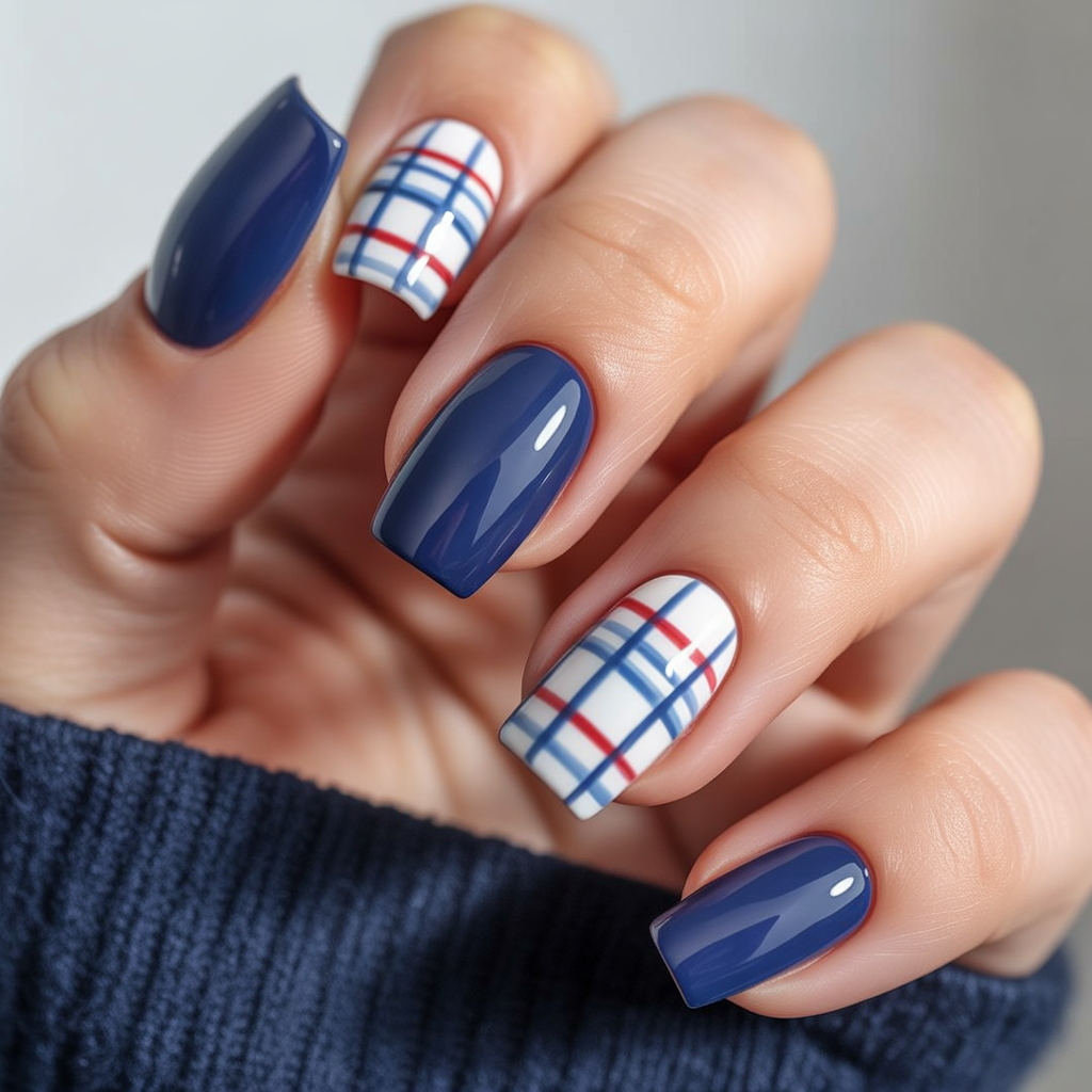 11. Blue Plaid Accent Nails with Clean, Simple Appeal
