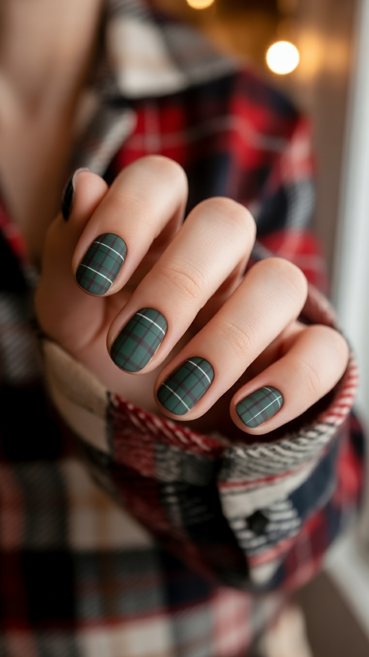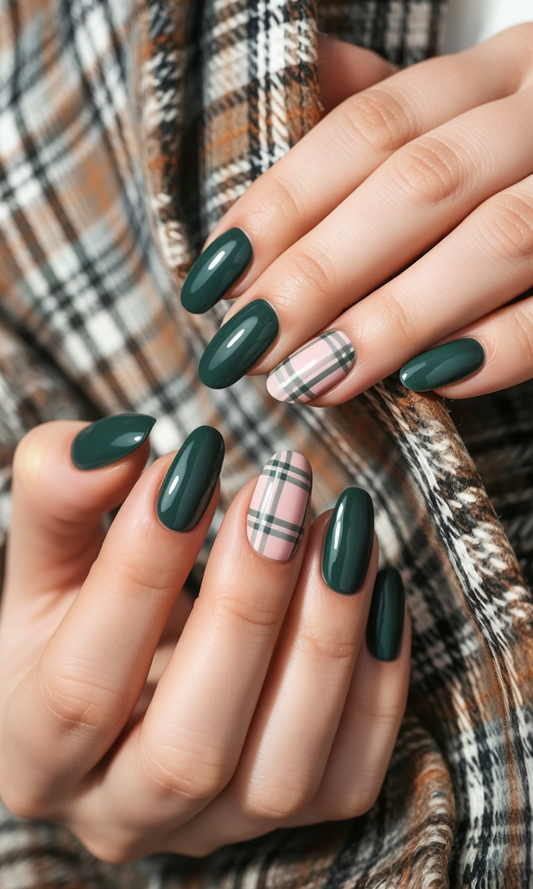 14. Deep Green Plaid Nails with Cozy Fall Energy