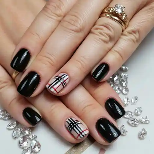 This manicure has a bold, confident energy without feeling flashy. The glossy black nails create a sleek foundation, while the plaid accent nail adds just enough detail to make the look feel intentional and stylish. It’s modern, chic, and slightly edgy, perfect for women who like clean lines with personality.