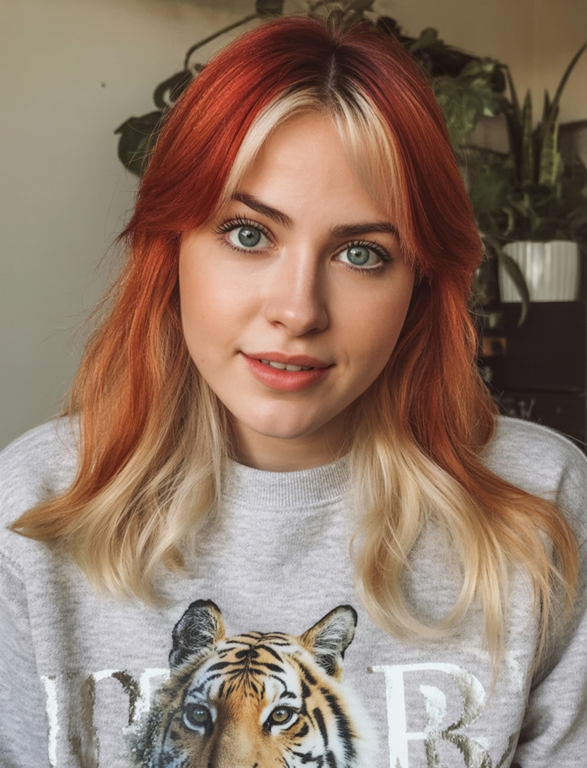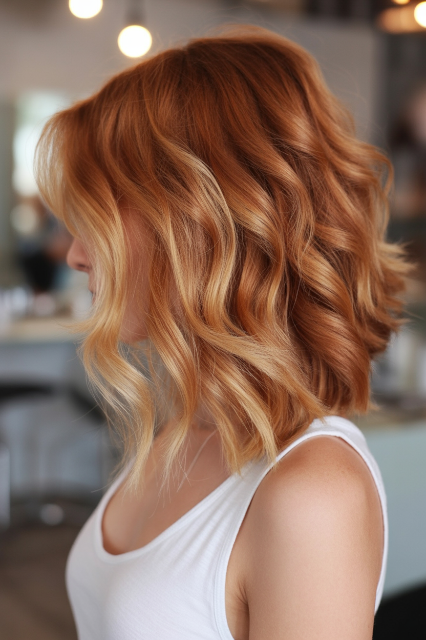 There is something irresistibly beautiful about the soft ginger waves adorned with light blonde strips right around the face area. The copper undertones give the hair an effortless glow, whereas the lighter strips provide an airy feeling—almost akin to the way sunlight settles in your locks on a relaxed Sunday morning!