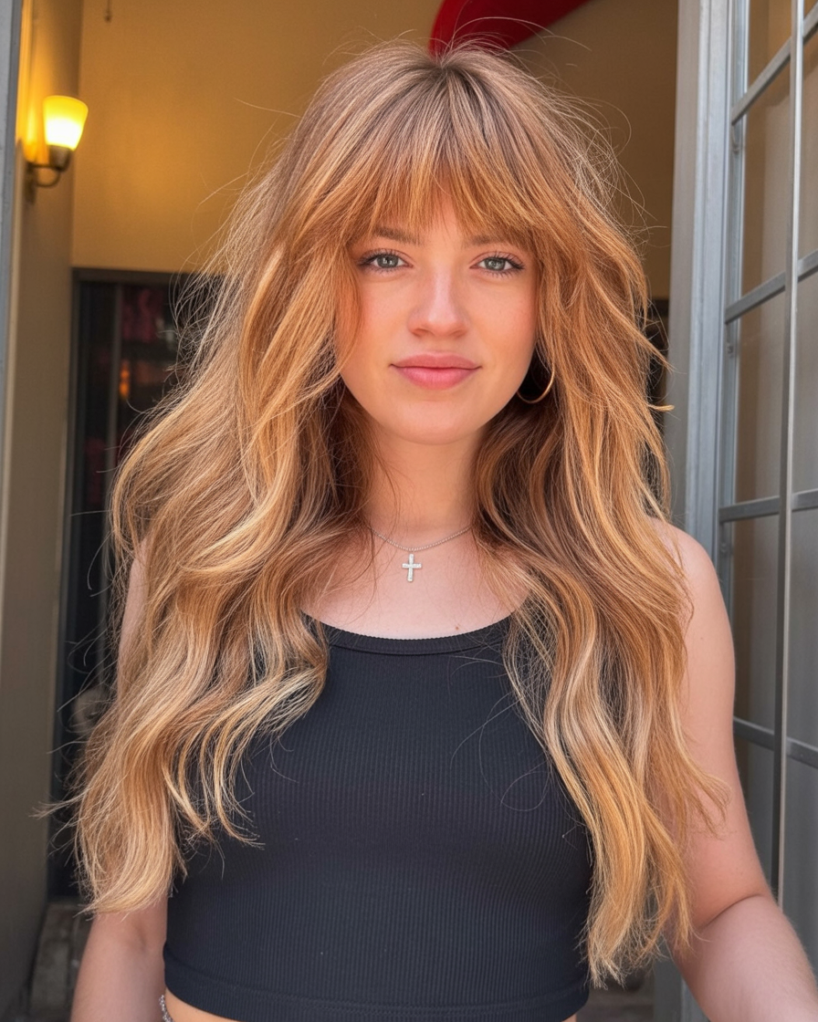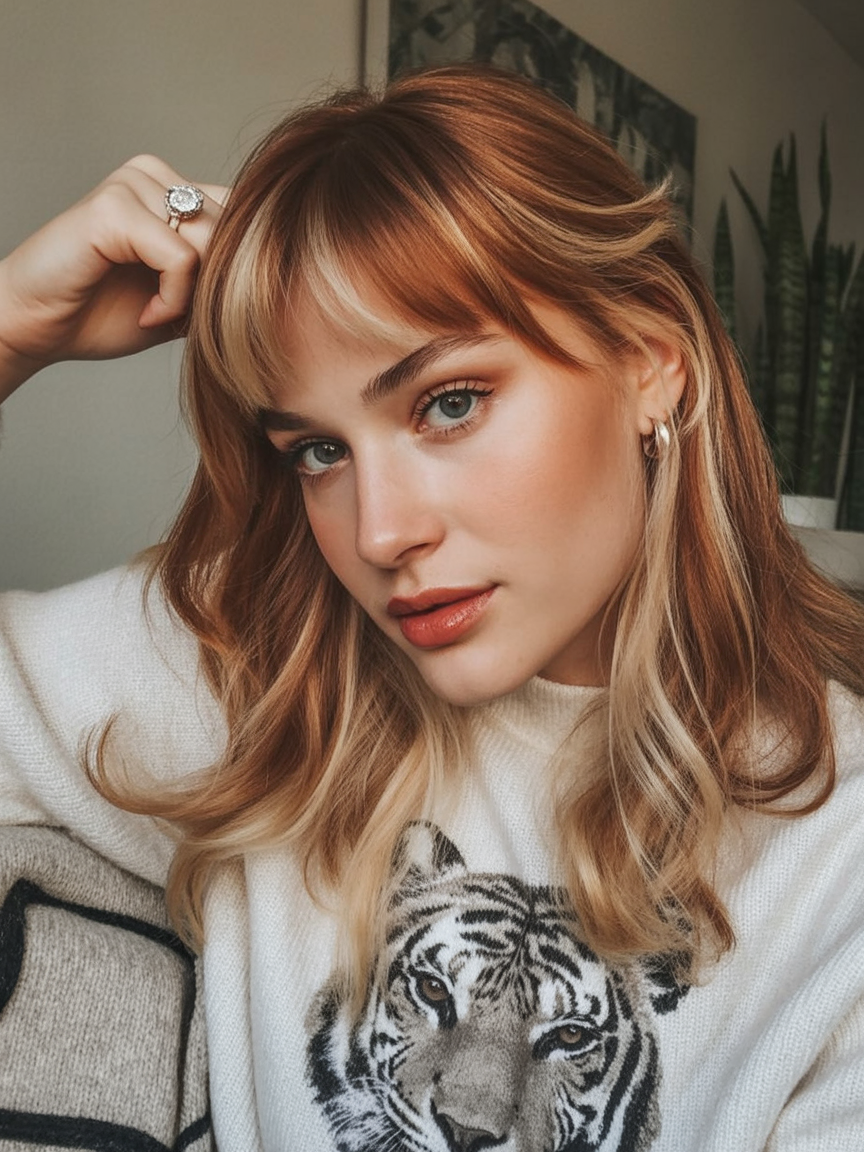 9. Soft Ginger with Feathered Bangs and Blonde Accents