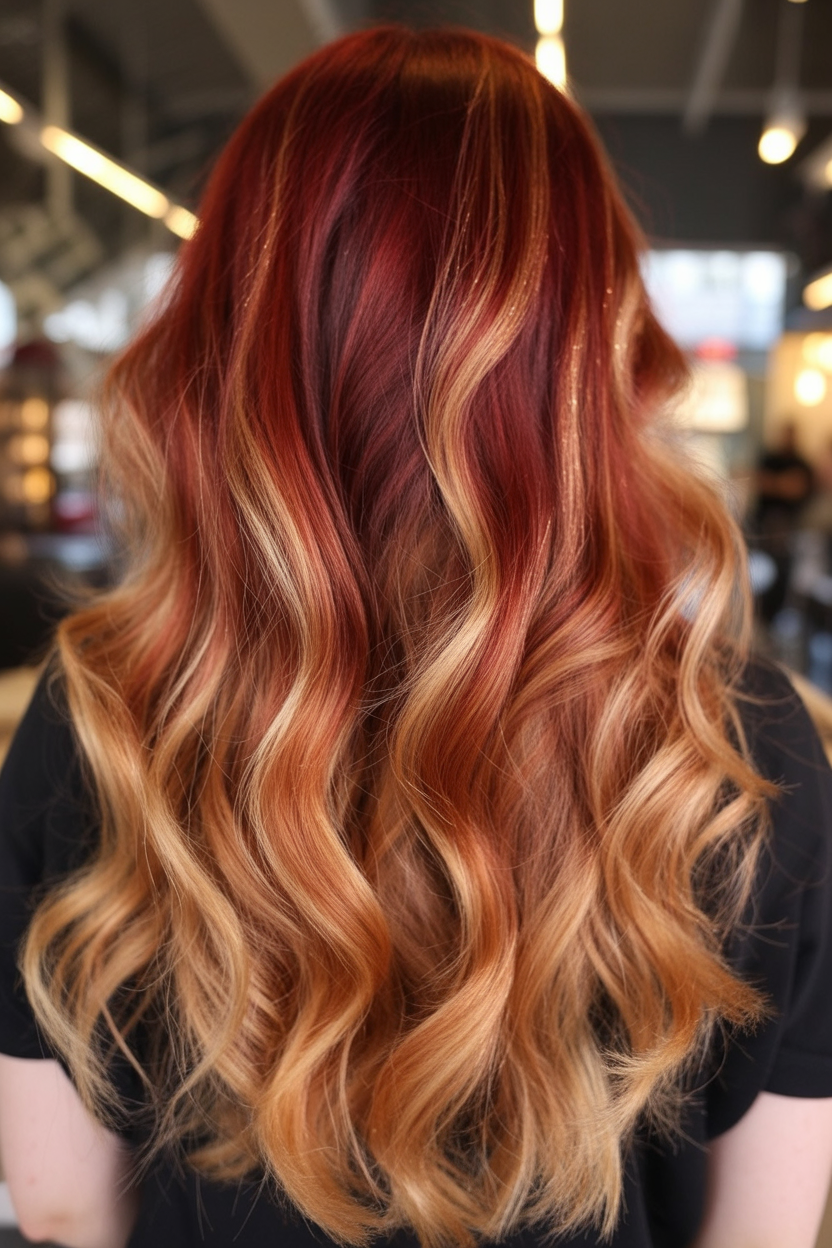 This deep cherry color combined with golden blonde highlights is totally fearless and totally fabulous. The deep, dark reds and burgundy shades fade seamlessly to honey-colored ends, so it has depth and dimension that commands attention without being in-your-face. It is bold, beautiful, and a little bit spicy—it would suit someone who loves color with attitude.