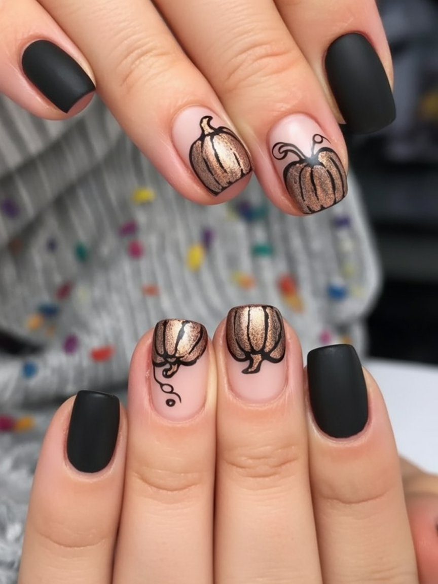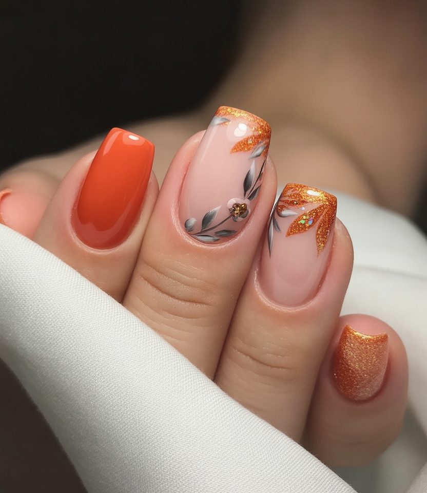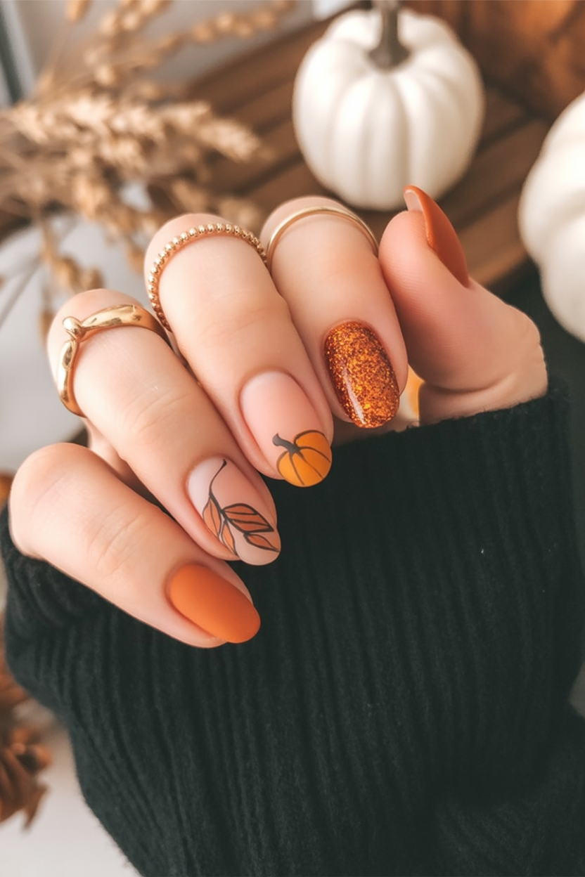 Seasonal, sweet and utterly Instagram-worthy, the nail design is an ode to pumpkin patches and crunchy leaves. An interlocking of the matte orange, glitter, and fine-line art is festive and trendy. It has the big sweater vibes that you feel like you want during October days.
