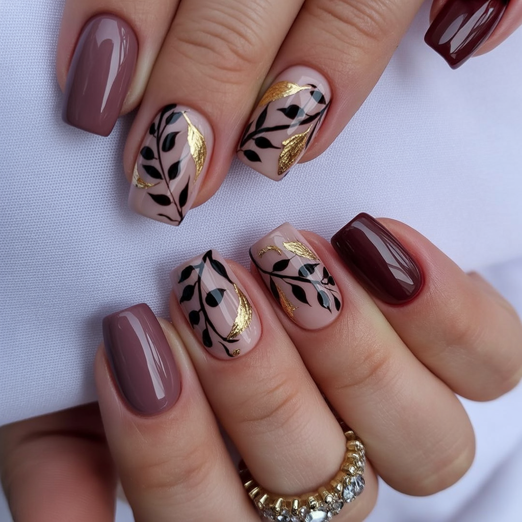 This look is pure drama—with a graceful twist. The base colors are also burgundy and mauve, which make you feel like you have a glass of good wine by the fire and the black and gold leaf design across the nails takes you to the places of a fairytale. Halloween does not necessarily have to be filled with ghosts; where elegance makes the best story.