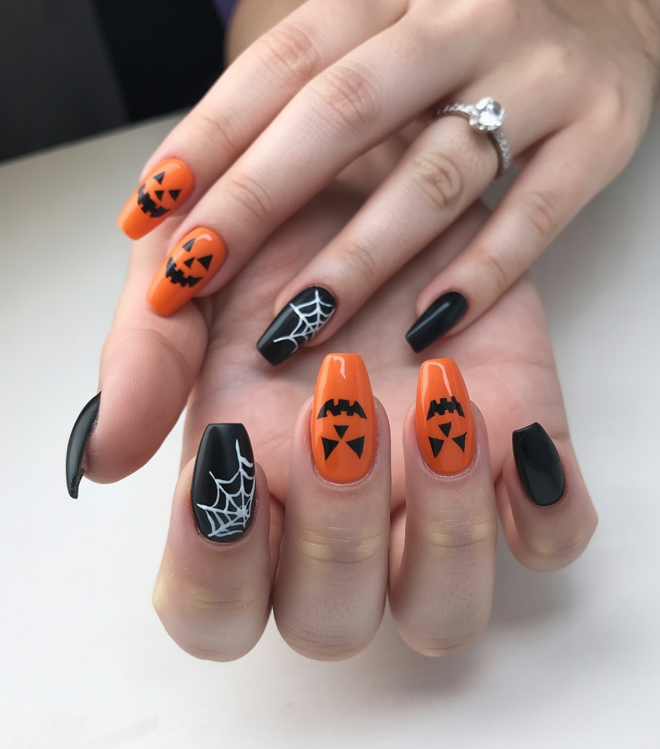 Cheeky jack-o lantern faces on orange coffin nails with complex spider webs? Yes, please! This is Halloween spirit in full blast, cheerful, merry, and full of nostalgic energy. It’s like wearing your favorite decorations on your fingertips.