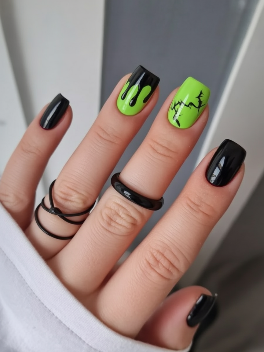It is shouting Halloween–gay Halloween, edgy Halloween. Neon green with jet-black polish and stitched nail art come off as Beetlejuice to Frankenstein. It is fun, a bit subversive, and only slightly creepy which is the best way.