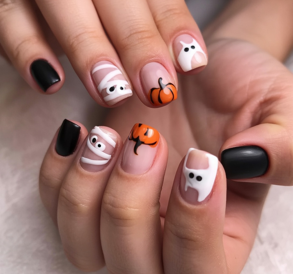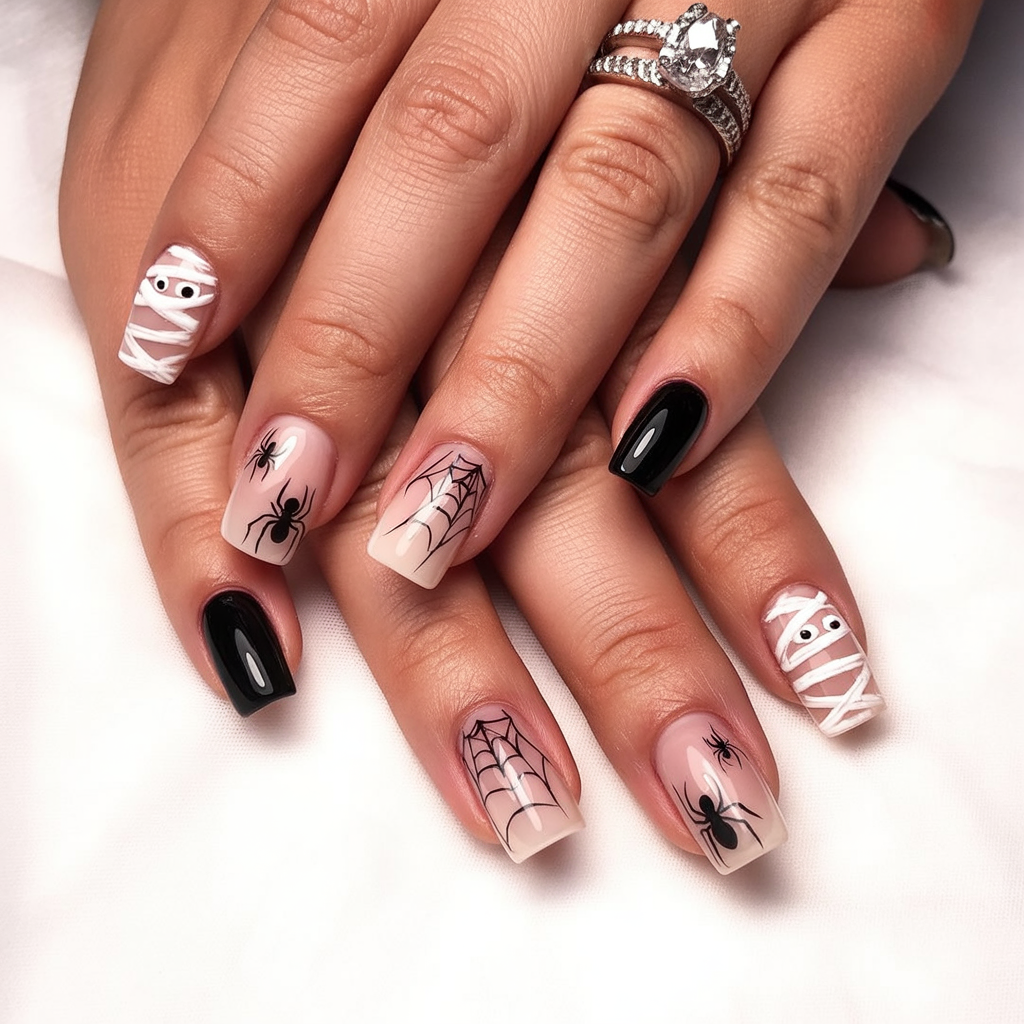 If you like your Halloween fun-packed, this one’s for you. Mummies, spiders, and webs creep on every nail as a mini horror tale- detailed on every fingertip. It’s cheeky, bold, and totally Halloween-ready.