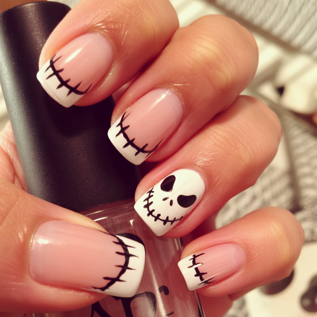 Be your inner Halloween queen with this reference to Nightmare before Christmas. These back to front French accents that have been sewn using black stitches and capped by the haunting grin on Jack are both iconic and edgy.