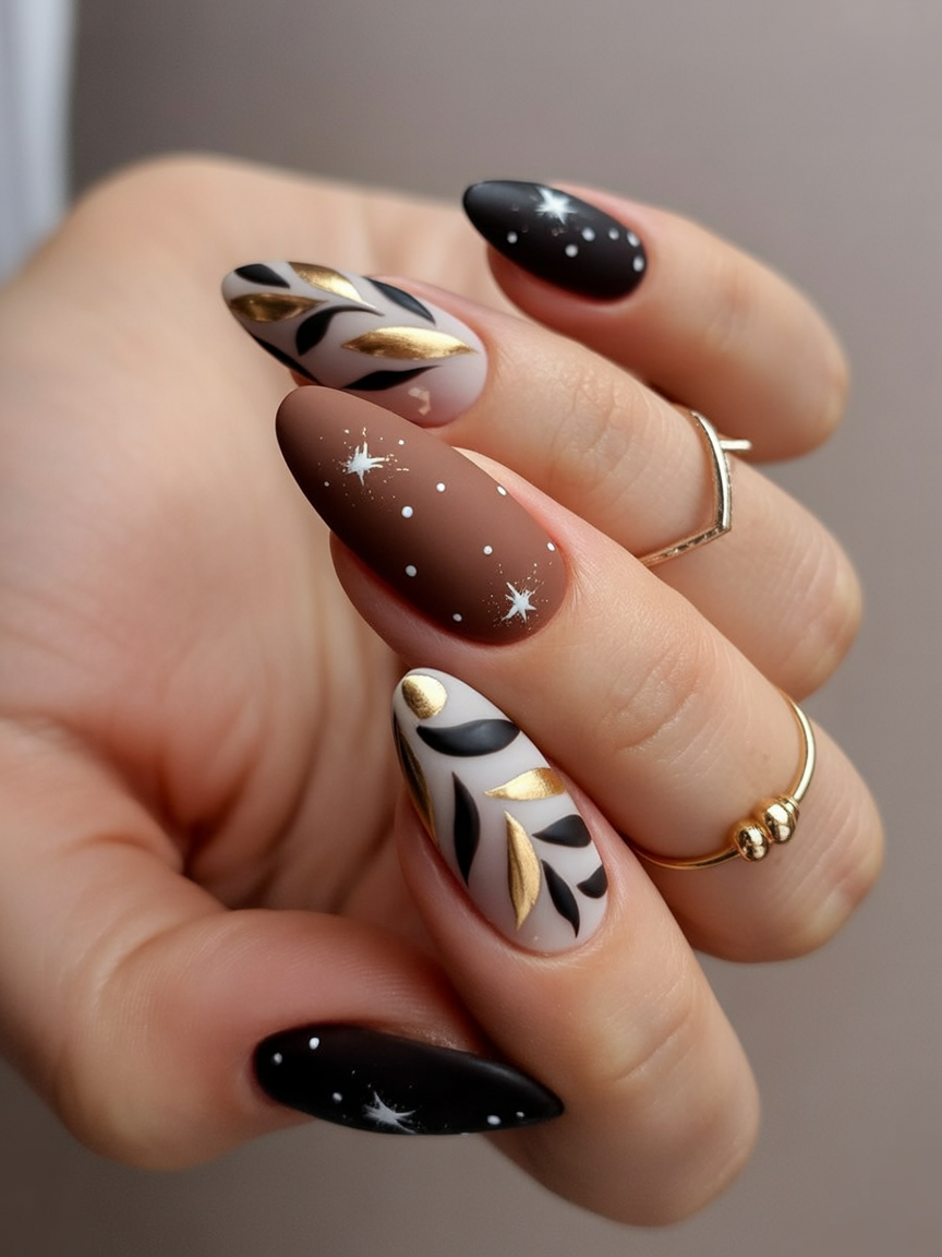 This deep green with cocoa brown combination is so earthy and unintentionally edible; the golden leaves make it even more soothing. It is something like a pleasant stroll thru the forest at the end of october, when the leaves all snap when you walk on them, and the air is warm cider. These nails swear autumn rather then scream Halloween, but the more magical they are.