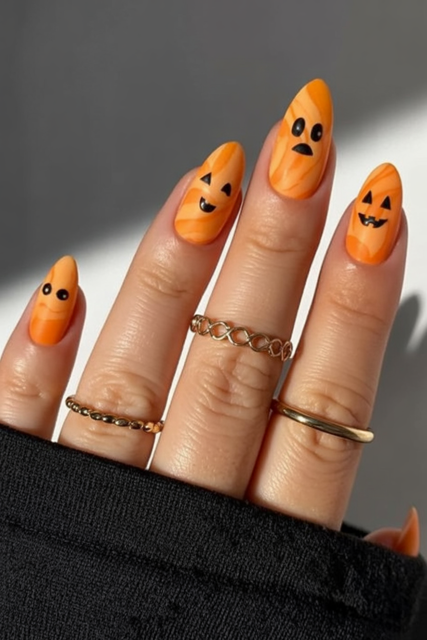 These bright orange jack-o’-lantern faces are here to steal the show. Every nail has got a different expression on it, making your hand A Halloween cartoon strip in the best of ways. Silly, playful, and guaranteed to spark smiles.