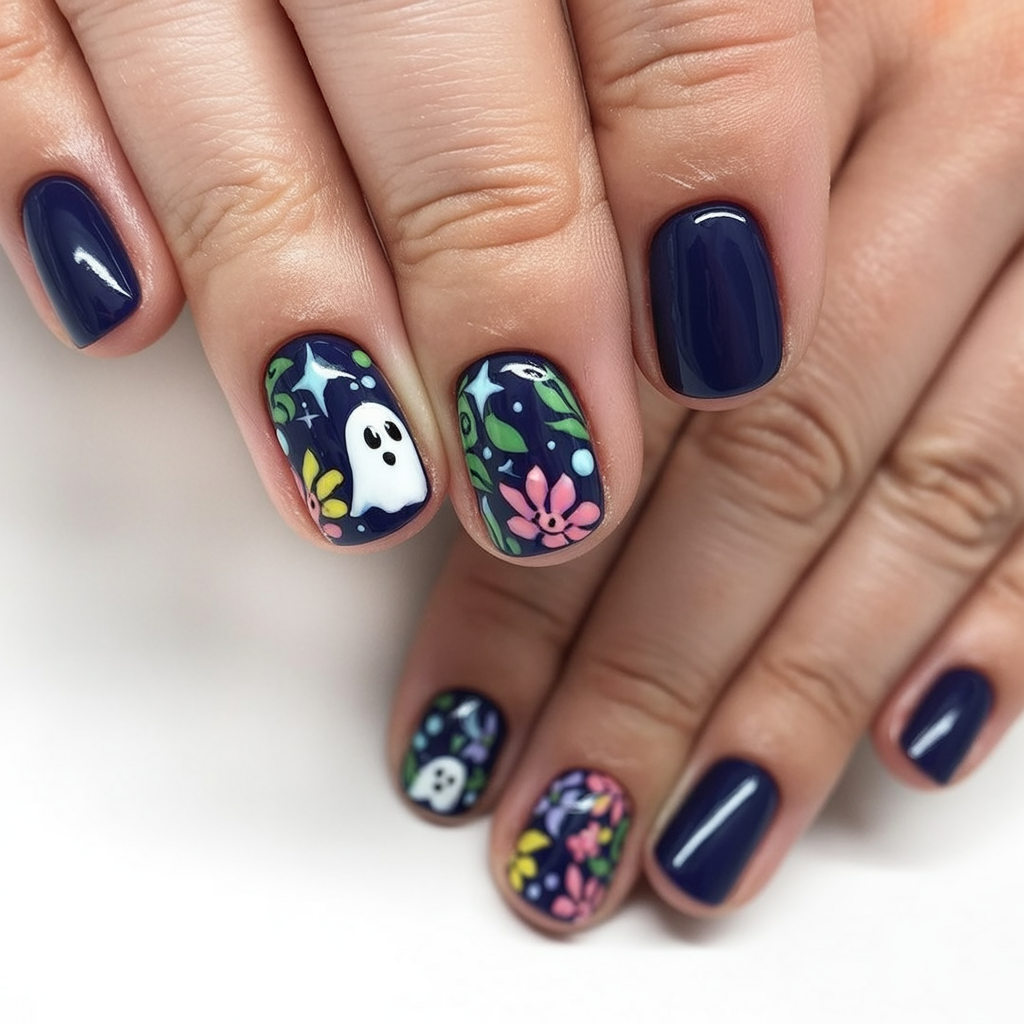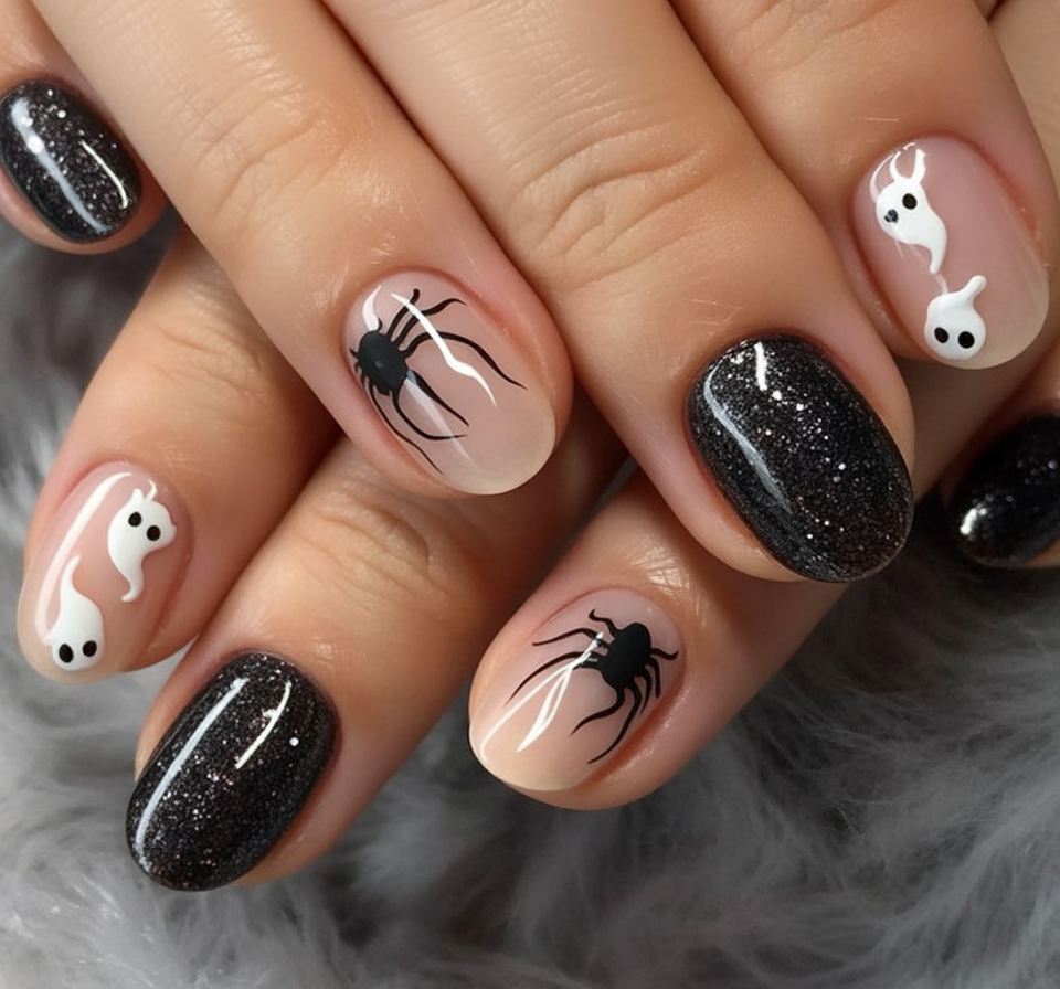 How about all that spooky look and glitzy? Who would have thought that ghosts and glitter would combine so well? The sparkly black and small white ghosts painted by hand make this design get out the elegant, though still playful side. The spiders provide a touch of Halloween excitement but not so serious.