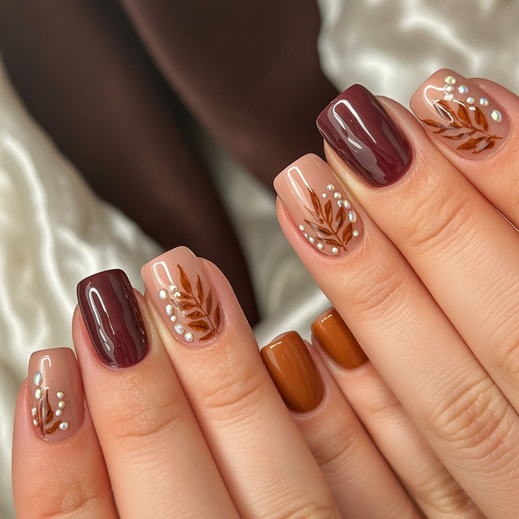 They are like a warm blanket across your feet in the solid state of the manicure. Down-to-earth earthy browns and deep wine colors are diluted with light leaves and small pearls producing a romantic down-to-earth fall vibe that fits right in throughout the season.