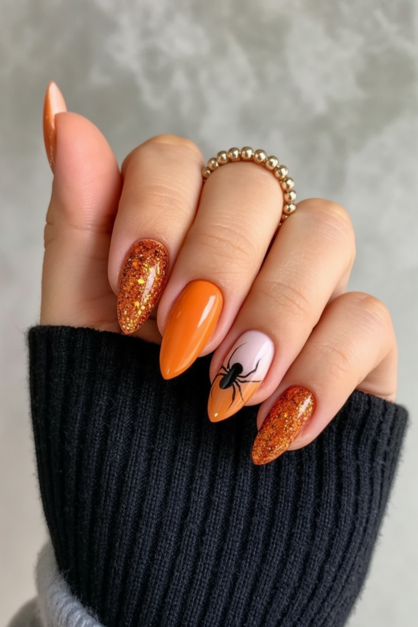 This glitter orange and black combination are adorable and friendly. Short almond nails! – Excellent, use it on women who would like a warm and girly version of Halloween instead of imitating a horror.