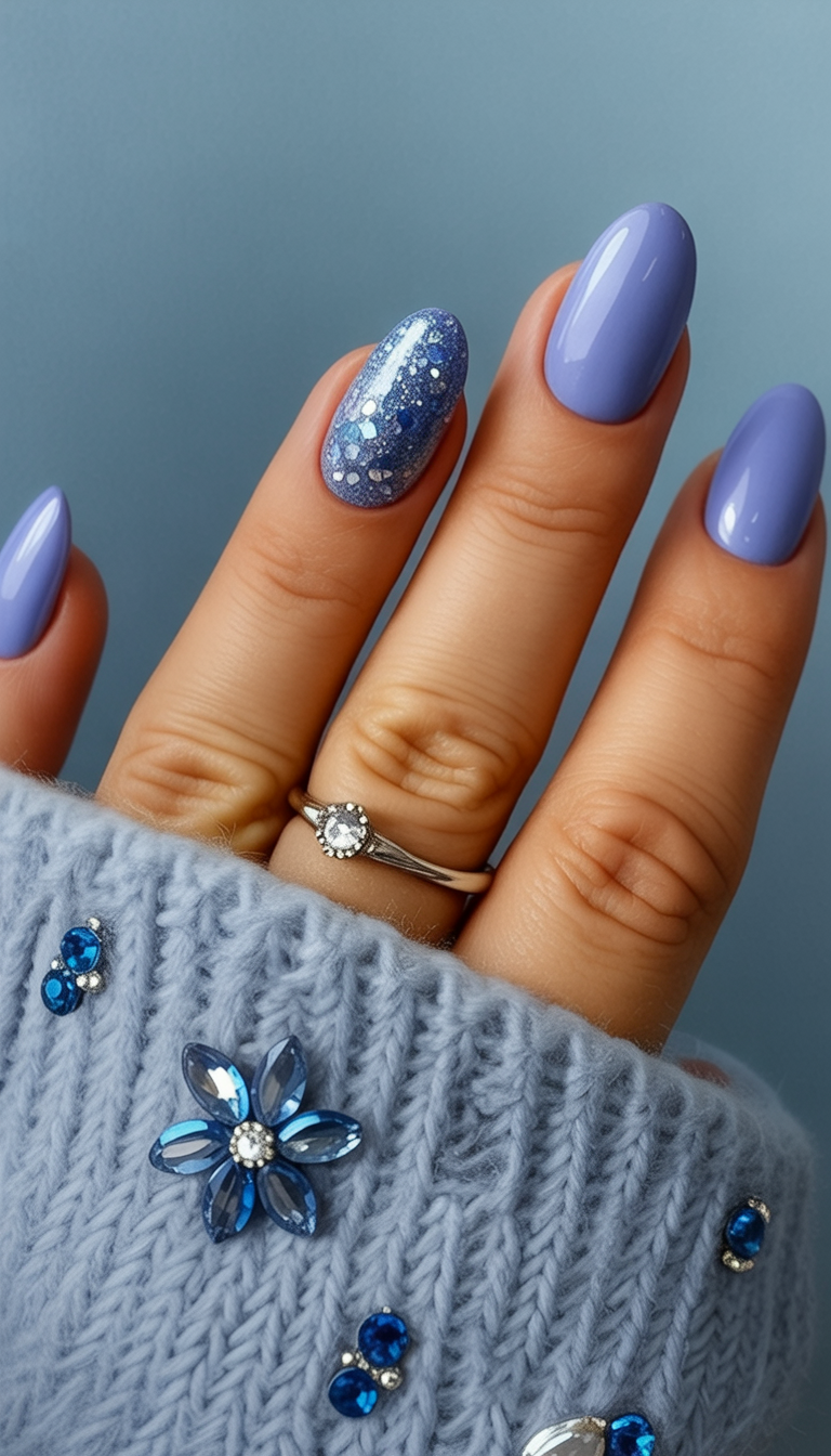 These light blue nails embody comfort and warmth in themselves, reminding you of snowy winter mornings—wearing a knitted sweater, drinking coffee, and observing the frost sparkling outside. One glittery accent nail is enough to communicate the festivity of the season but not overpower the overall tranquility of the design.